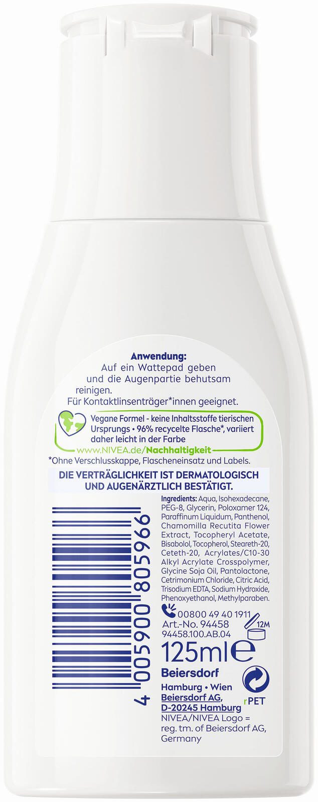 - Augen Make-up Entferner entfernt gründlich wasserfeste Mascara und Make-Up. Für Kontaktlinsenträger*innen geeignet. 96 % recycelte Flasche (ohne Verschlusskappe und Labels). Vegane Formel. Pflegt die Augenpartie. Mit Kamillen-Extrakt und Provitamin B5