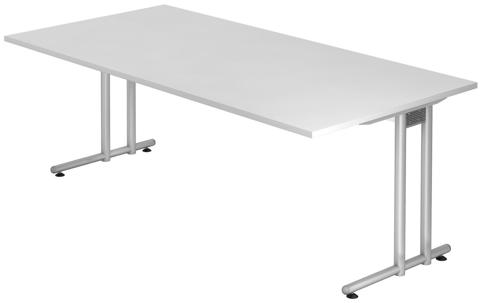 Der HAMMERBACHER Schreibtisch VNS2E/W/S in elegantem Weiß ist die perfekte Wahl für Ihr modernes Büro oder Homeoffice. Mit seinen großzügigen Maßen von 200 cm in der Breite, 100 cm in der Tiefe und 72 cm in der Höhe bietet dieser Schreibtisch ausreichend Platz für Ihre Arbeitsmaterialien und sorgt gleichzeitig für eine angenehme Arbeitsatmosphäre. Die Tischplatte besteht aus robuster Spanplatte, die nicht nur langlebig, sondern auch pflegeleicht ist. Das silberfarbene Stahlgestell mit einem stabilen C-Fuß-Gestell sorgt für eine hohe Standfestigkeit und verleiht dem Schreibtisch eine ansprechende, moderne Optik. Die Kombination aus der weißen Tischplatte und dem silbernen Gestell schafft einen harmonischen Kontrast, der in jede Einrichtung integriert werden kann. Der Schreibtisch ist nicht nur funktional, sondern auch ästhetisch ansprechend. Durch das schlichte Design fügt er sich nahtlos in verschiedene Einrichtungsstile ein und bringt frischen Wind in Ihren Arbeitsbereich. Da der Schreibtisch über keine Schubladen oder Fächer verfügt, haben Sie die Möglichkeit, ihn individuell mit Ihren persönlichen Büromaterialien und Dekorationen zu gestalten. Die Verwendung hochwertiger Materialien gewährleistet eine hohe Stabilität und Langlebigkeit, sodass Sie lange Freude an Ihrem neuen Arbeitsplatz haben werden. Der HAMMERBACHER Schreibtisch VNS2E/W/S ist somit nicht nur ein Möbelstück, sondern ein praktischer Begleiter für Ihre täglichen Aufgaben und ein stilvolles Element in Ihrem Raum.