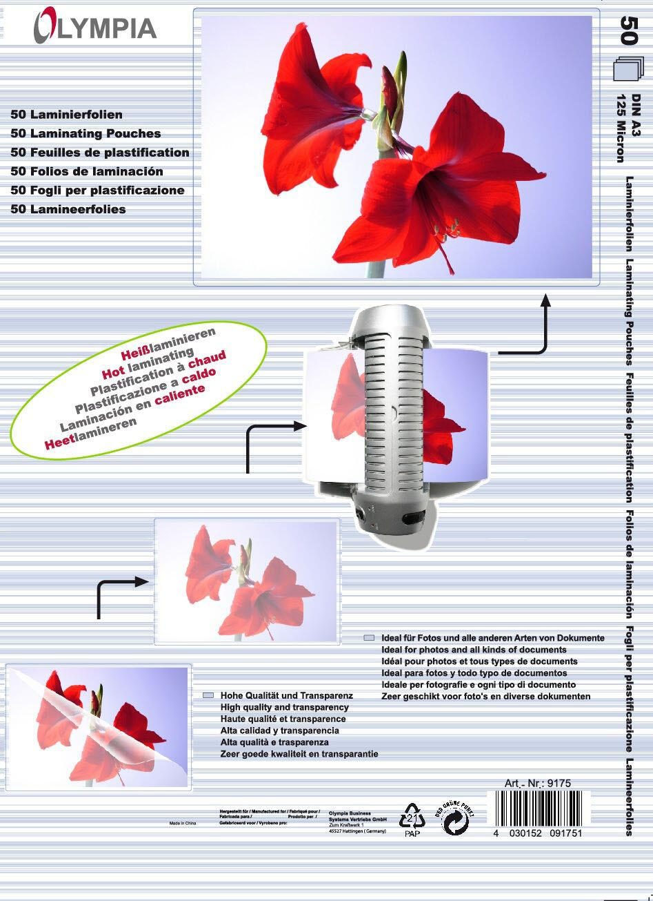 Die OLYMPIA Laminierfolien glänzend mit einer Stärke von 125 Mikron sind die perfekte Lösung, um deine Dokumente im A3-Format professionell zu laminieren und zu schützen. Diese hochwertigen Folien bieten nicht nur einen ansprechenden Glanz, sondern sorgen auch dafür, dass deine Unterlagen vor Abnutzung, Feuchtigkeit und Verschmutzung bewahrt werden. Mit einer Packung von 50 Stück bist du bestens ausgestattet, um deine wichtigsten Dokumente, Fotos oder Präsentationen zu sichern. Die glänzende Oberfläche der Laminierfolien verleiht deinen Materialien eine lebendige und ansprechende Optik, die Farben intensiver erscheinen lässt. Ob für den Einsatz im Büro, in der Schule oder für kreative Projekte zu Hause – diese Laminierfolien sind vielseitig einsetzbar und bieten einen optimalen Schutz für alle deine A3-Dokumente. Dank der Folienstärke von 125 Mikron sind die Folien robust und langlebig, während die abgerundeten Ecken ein sicheres Handling gewährleisten und ein Reißen der Folien verhindern. Hergestellt aus hochwertigen Materialien wie Polyethylen und Ethylenvinylacetat, sind die OLYMPIA Laminierfolien nicht selbstklebend und bieten dennoch eine zuverlässige Laminierung, die deine Dokumente in einem einwandfreien Zustand hält. Die Folien sind ideal für alle, die Wert auf Qualität und Langlebigkeit legen. Die praktischen Maße von 30,3 x 42,6 cm machen die Laminierfolien zu einem unverzichtbaren Zubehör für jeden, der regelmäßig mit A3-Dokumenten arbeitet. Erlebe die Vorteile der OLYMPIA Laminierfolien und schütze deine wertvollen Unterlagen auf stilvolle Weise.Technische Daten