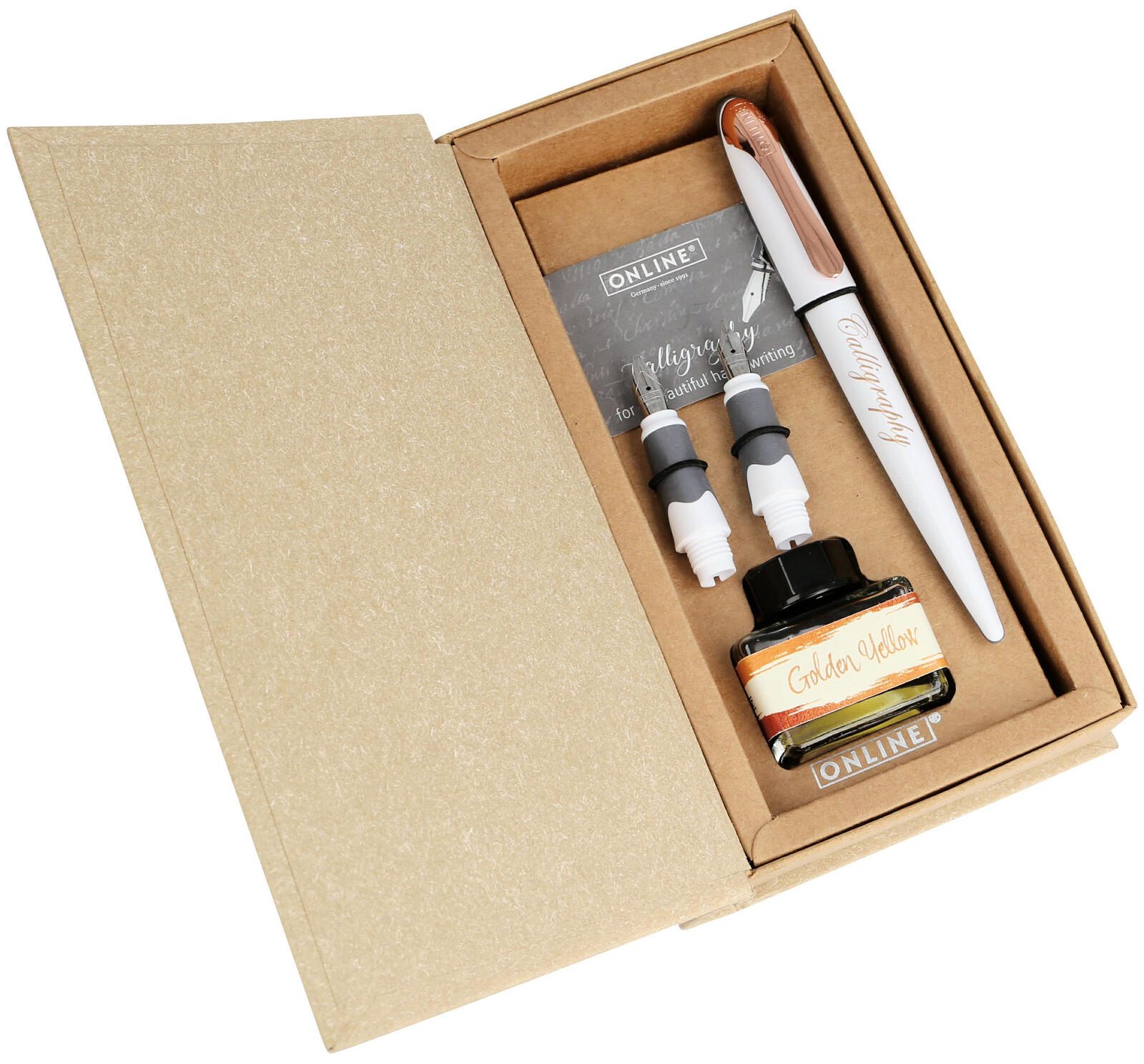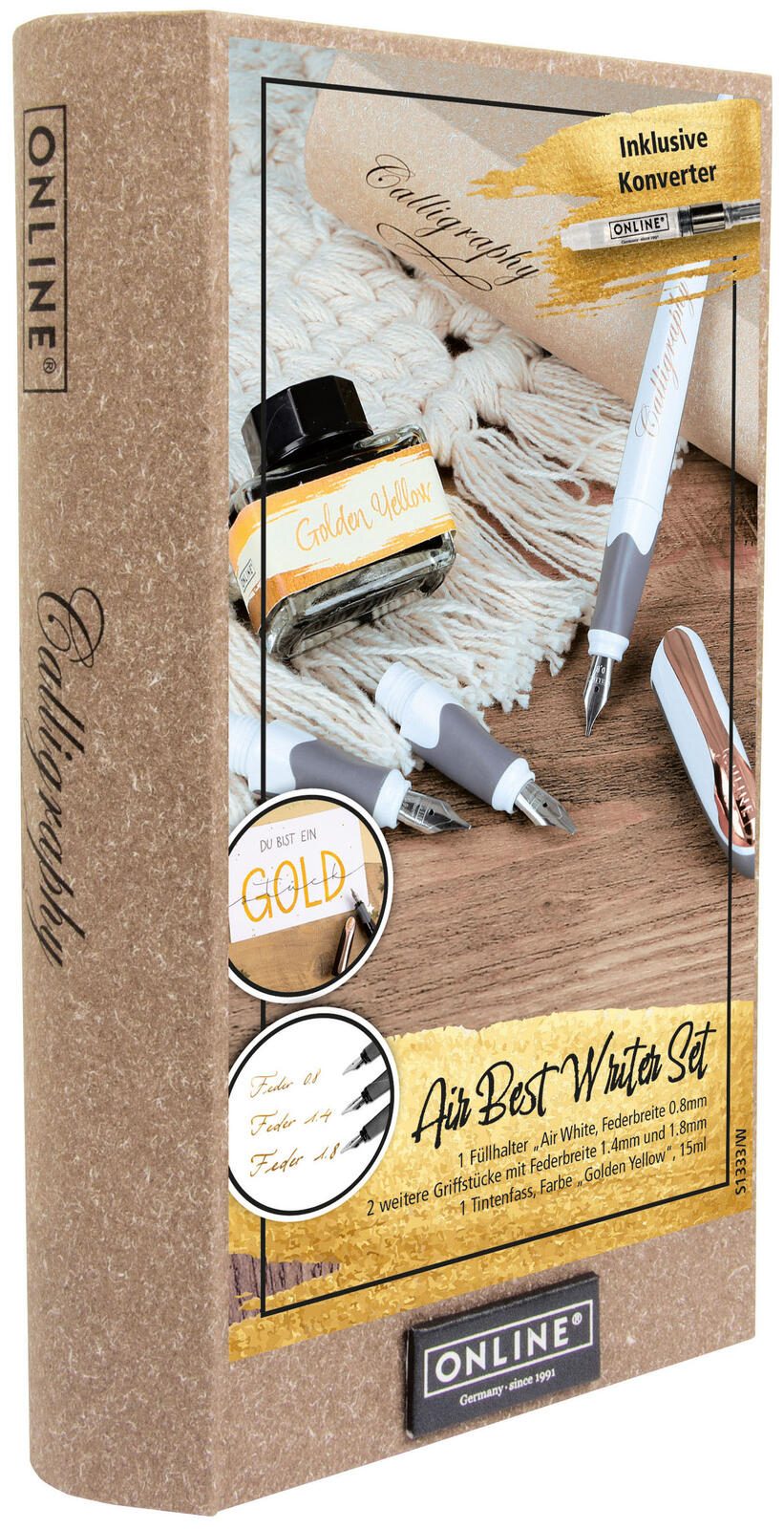 Bei der Lieferung des Online Füllhalters AirBest wß ist alles enthalten, was du brauchst, um sofort loszulegen. Neben dem Füllhalter erhältst du 3 verschiedene Griffstücke, 15ml Tinte in der Farbe Gelb und ein praktisches Buchetui zur Aufbewahrung. So hast du immer alles griffbereit, wenn du kreativ werden möchtest.