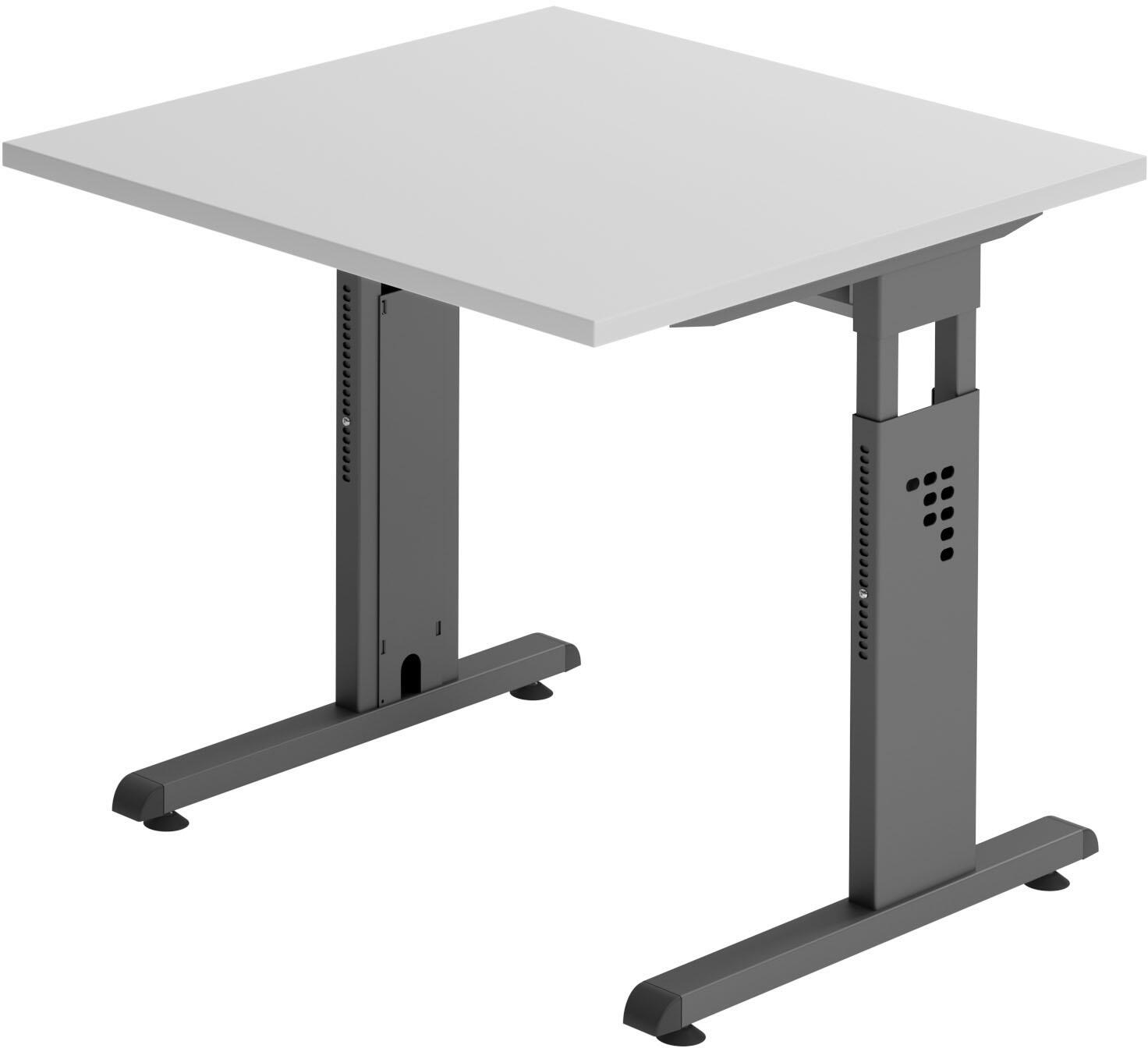 Der HAMMERBACHER höhenverstellbare Schreibtisch VOS08/5/G in lichtgrau vereint Funktionalität und modernes Design. Mit einer quadratischen Tischplatte aus robuster Spanplatte und einem stabilen C-Fuß-Gestell aus Stahl bietet dieser Schreibtisch eine solide Basis für Ihr Büro oder Homeoffice. Die elegante lichtgraue Farbe sorgt für eine angenehme Arbeitsatmosphäre und lässt sich mühelos in verschiedene Einrichtungsstile integrieren. Mit den Maßen von 80 cm x 80 cm x 65 cm ist dieser Schreibtisch kompakt und dennoch geräumig genug, um Ihre Arbeitsutensilien optimal zu platzieren. Der höhenverstellbare Mechanismus ermöglicht es Ihnen, die Tischhöhe individuell anzupassen, um eine ergonomische Sitz- oder Stehposition zu finden. Dies fördert nicht nur Ihre Gesundheit, sondern steigert auch Ihre Produktivität, indem Sie bequem und flexibel arbeiten können. Das Gestell in grafit sorgt für einen modernen Kontrast zur hellen Tischplatte und verleiht dem Schreibtisch eine stilvolle Note. Der Schreibtisch ist ohne Fächer oder Schübe gestaltet, was ihn besonders vielseitig macht und Ihnen die Freiheit gibt, Ihre Arbeitsfläche nach Ihren Wünschen zu gestalten. Der HAMMERBACHER VOS08/5/G ist nicht nur ein funktionales Möbelstück, sondern auch ein Statement in jedem Raum. Er bietet Ihnen die Möglichkeit, Ihre Arbeitsumgebung aktiv zu gestalten und gleichzeitig ergonomische Vorteile zu genießen. Ideal für alle, die Wert auf Qualität, Design und Gesundheit legen.Technische Daten