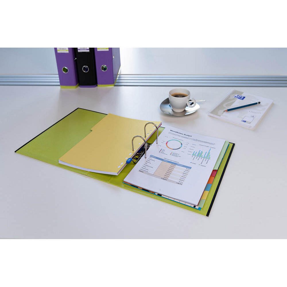 Der OXFORD myColour Strong-Line Ordner aus Kunststoff in der eleganten Farbe Schwarz bietet dir eine ideale Lösung zur Organisation deiner Dokumente im DIN A4 Format. Mit einer Rückenstärke von 8,0 cm bietet dieser Ordner ausreichend Platz für deine Unterlagen und sorgt dafür, dass alles ordentlich und übersichtlich verstaut ist. Die Prämisse des Designs liegt auf Funktionalität und Langlebigkeit. Der Ordner ist mit einer Präzisions-Hebelmechanik ausgestattet, die ein einfaches Öffnen und Schließen ermöglicht, während die Raumsparschlitze im Deckel dafür sorgen, dass der Ordner sicher verschlossen und platzsparend verstaut werden kann. Der Kunststoffeinband des Ordners ist nicht nur schmutzabweisend, sondern auch besonders stabil und langlebig, was ihn zu einem perfekten Begleiter für den täglichen Gebrauch macht. Mit dem zusätzlichen Kantenschutz bist du vor unschönen Macken und Beschädigungen geschützt, sodass dein Ordner stets in einwandfreiem Zustand bleibt. Die praktische Griffloch erleichtert das Herausnehmen des Ordners aus Regalen oder Aktenschränken, was dir den Alltag erheblich erleichtert. Ein weiteres Highlight ist die auswechselbare Rückenetikett-Tasche, die dir ermöglicht, den Inhalt des Ordners jederzeit zu kennzeichnen und zu ändern. So behältst du immer den Überblick über deine Dokumente. Der OXFORD myColour Strong-Line Ordner ist eine hervorragende Wahl für alle, die Wert auf Qualität und Funktionalität legen, ohne dabei auf ein ansprechendes Design verzichten zu wollen. Egal, ob für das Büro, die Schule oder zu Hause, dieser Ordner wird deinen Anforderungen gerecht und sorgt für Ordnung in deinen Unterlagen.Technische Daten