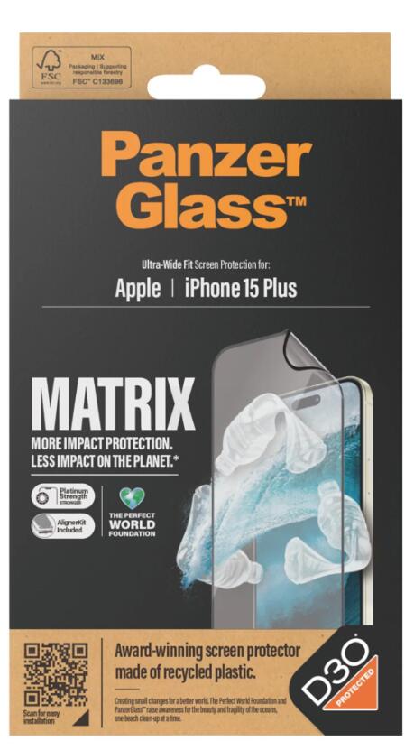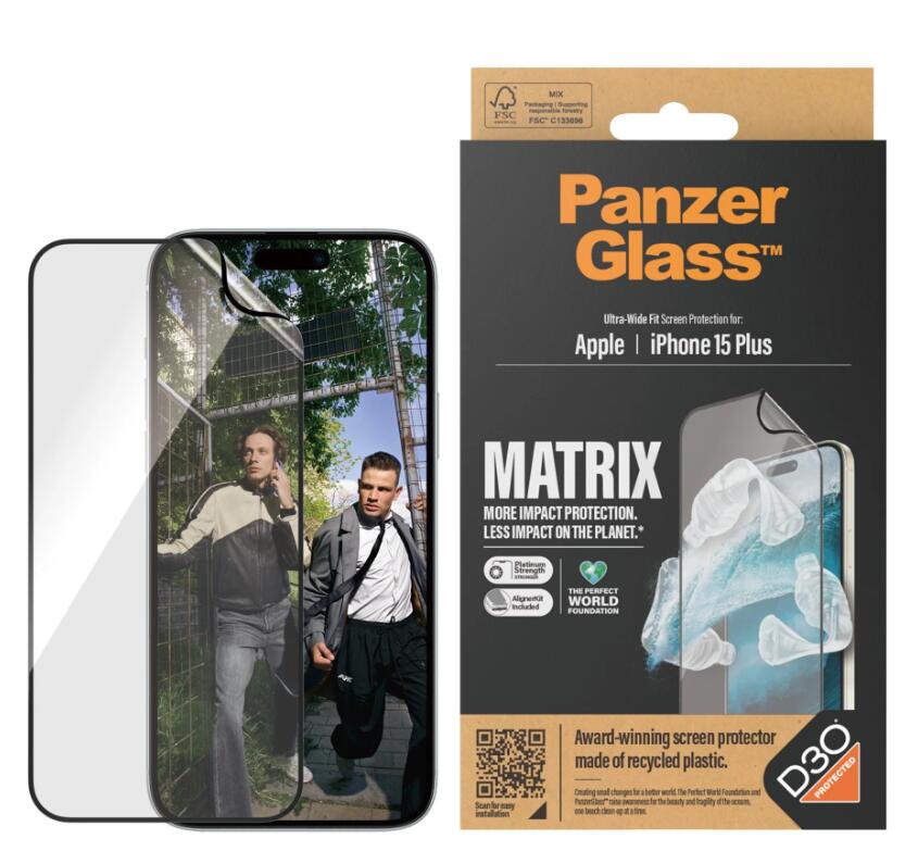 Wir brauchen Veränderung. Und die preisgekrönte MATRIX Displayschutzfolie von PanzerGlass™ IST Veränderung. Sie besteht aus 100% recyceltem Kunststoff. Sie wurde entwickelt, um die Lebensdauer deines Telefons zu verlängern. Sie wird in einer FSC™-zertifizierten Verpackung geliefert. Sie benötigt ca. 30 %* weniger Papierverpackung als frühere MATRIX-Modelle. Es verfügt über den D3O®-Aufprallschutz, der auch militärische Elitetruppen schützt. UND er schützt deinen Bildschirm vor versehentlichen Stößen, Stürzen und anderen Gefahren des Alltags. Mit anderen Worten: Bei MATRIX gibt es keine Abkürzungen oder "gut genug". Es ist einfach härter als hart.