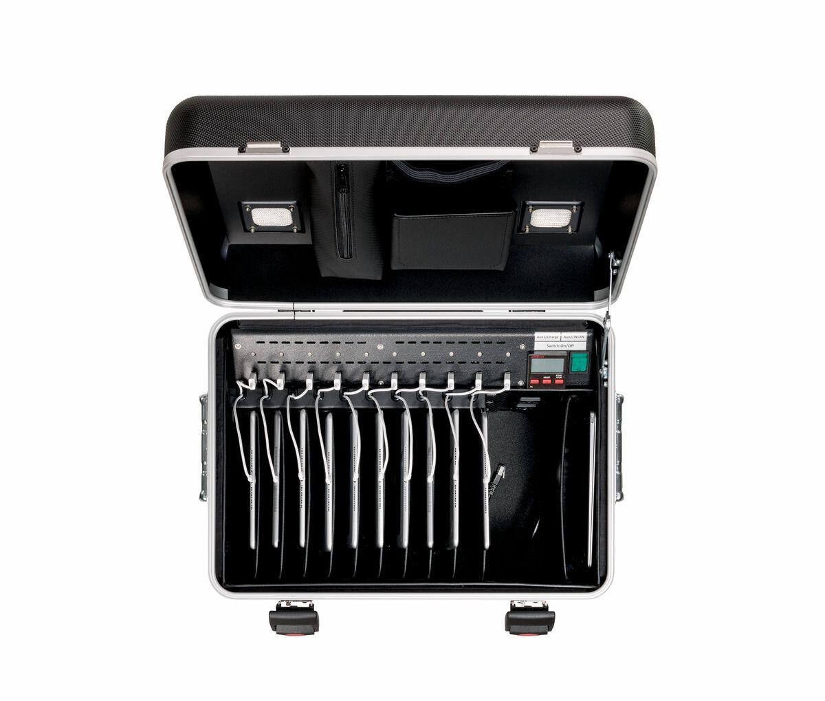 Mit dem PARAPROJECT® Case i10 Typ-C lassen sich problemlos 10 Tablets in der zentralen Lade- und Synchronisationsstation aufbewahren und transportieren. Der flexible Systemkoffer bietet in 10 Fächern aus Con-Pearl®, Raum für bis zu 10 Geräte, die er über die zentrale Lade- und Sync-Einheit in optimaler Geschwindigkeit lädt und synchronisiert. Kompatibel ist der neue PARAPROJECT® Case i10 Typ-C mit allen Geräte, die mit USB-C® Anschluss geladen werden können. Dank der zehn im Lieferumfang enthaltenen USB-C®-Kabeln steht einer raschen Inbetriebnahme nichts im Wege. Seine in Reihe positionierten USB-Anschlüsse ermöglichen ein sauberes Kabelmanagement. Darüber hinaus stehen Anschlussmöglichkeiten für einen Master Laptop, für Zubehör wie zum Beispiel einen Accesspoint zur Verfügung. Sein 4-Rollen-Konzept „EasyMove“ und der bis zu einem Meter ausziehbare Teleskopgriff machen das Handling des Koffers besonders angenehm. Ebenso erleichtern seitlich montierte Griffe das Tragen. Damit die Geräte im Case vor unbefugtem Zugriff geschützt sind, sind Zahlenschlösser mit verbaut. Die robuste schwarze Außenhülle aus X-ABS Kunststoff schützt zudem sicher vor äußeren Einwirkungen.