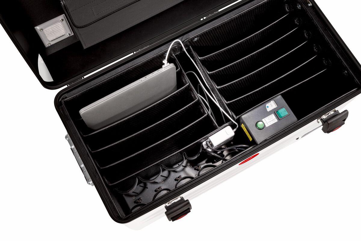 - Stauraum für insgesamt 10x Originalnetzteile für die Ladefunktion der Notebooks