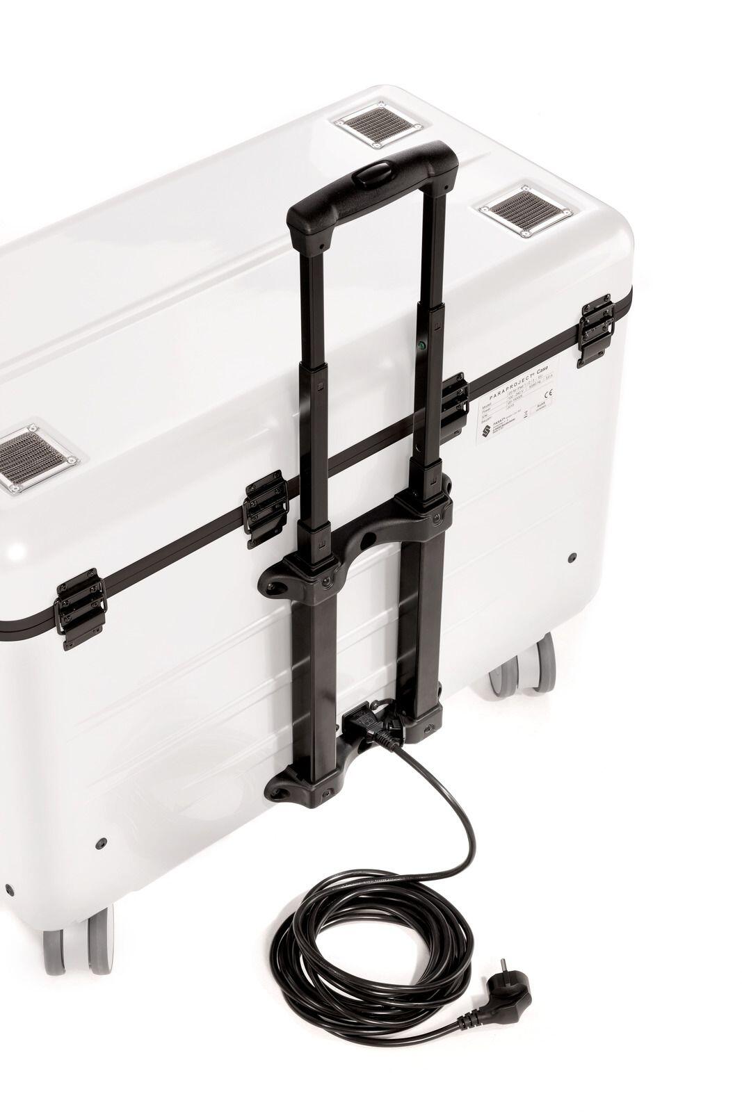 Das PARAPROJECT® Case N10 ist die ideale Transport- und Ladestation für zehn Note-, Ultra- oder Chromebooks bis 15,6‘‘. Der mit einem Zahlenschloss geschützte Systemkoffer verfügt über ausreichend Stauraum für die Originalnetzteile und bietet über den internen Timer die Möglichkeit, Ladezeiten individuell einzustellen. Neben der separaten Steckdose für einen Access Point verfügt das Case zudem über Öffnungen im Deckel und Bodenbereich, um eine optimale Luftzirkulation sicherzustellen. Die schlagzähe Außenschale aus gummiertem X-ABS-Kunststoff sowie der umlaufende Aluminiumrahmen am Deckel und Korpus sorgen für eine extrem hohe Stabilität. Innen mit 3-poligen IBM-Buchsen (C5) ausgestattet, werden alle Geräte über nur einen zentralen Stromanschluss verbunden. Transportieren lässt sich das PARAPROJECT® Case N10 bequem auf vier Leichtlaufrädern, per 4-fach Teleskopauszug als Trolley oder über zwei Tragegriffe. Im Lieferumfang enthalten sind zudem fünf Y-Adapter mit zwei Euro-8-Buchsen (2-polig).