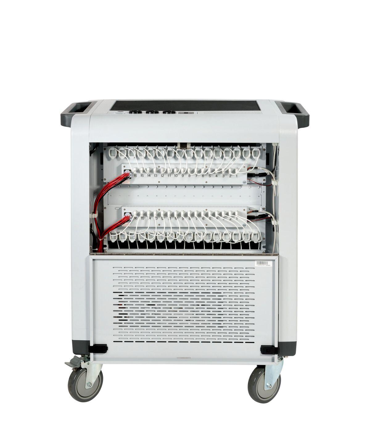 Der PARAPROJECT® Trolley i32 PRO dient zur sicheren Aufbewahrung und zugleich als Ladestation für bis zu 32 Tablets. Zum Laden oder Synchronisieren schiebt man die iPad einfach in die entsprechenden Slots und schließt sie mit MFI-zertifizierten Kabeln an. Der Trolley erkennt die USB Verbindung zum Host Computer und startet den Synchronisationsvorgang. Je nach Software können Nutzer diese Voreinstellungen ändern, bei Verwendung einer WIFI Umgebung ist auch die drahtlose Synchronisation möglich. Das System unterstützt Lightning Connector. Die versenkbare und verschließbare Schwenktür spart Platz und sichert vor Diebstahl.