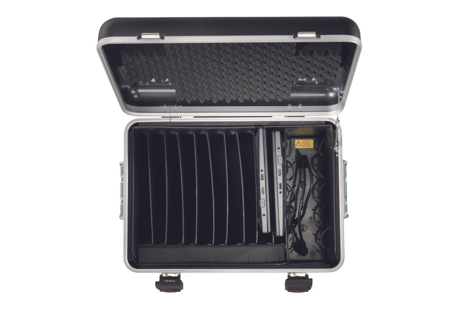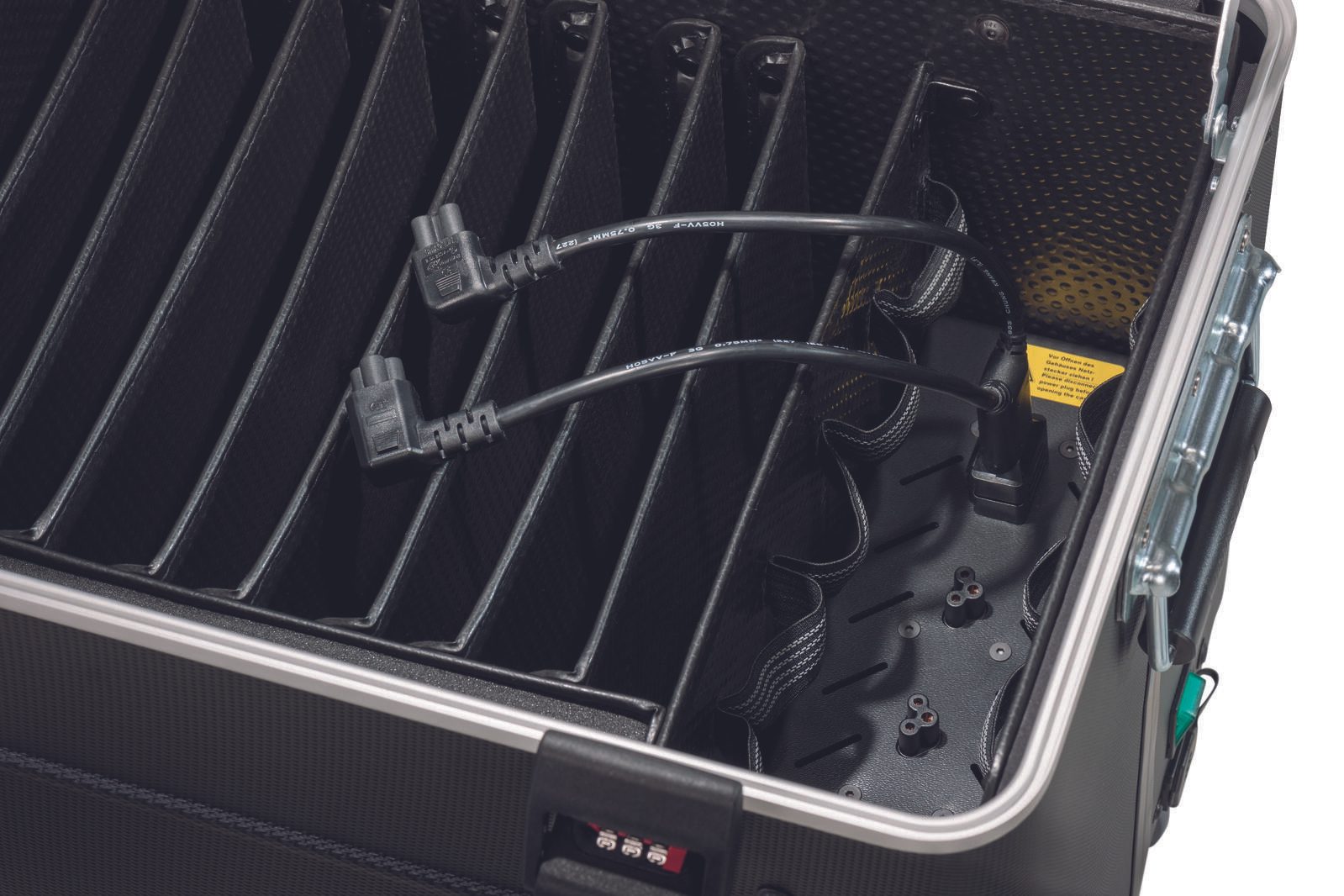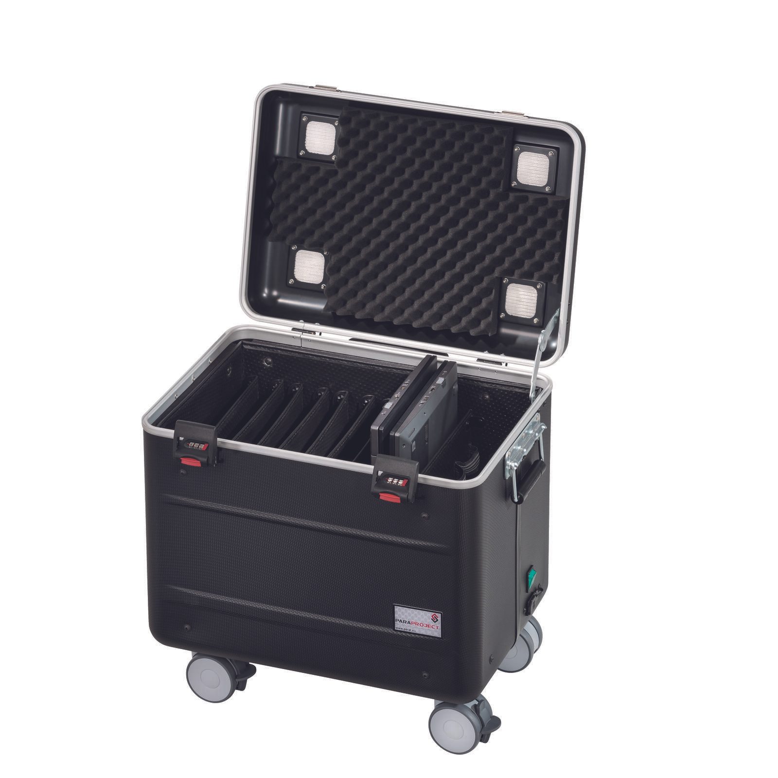 Das PARAPROJECT® Case C10 fasst problemlos bis zu zehn Chrome- oder Ultrabooks bis 15,6’’ in Einschubfächern aus formstabilen „ConPearl“-Kunststoffwaben. Da auch für die Originalnetzteile reichlich Platz vorhanden ist, gehören Kabelsalat und Co. der Vergangenheit an. Der Ladevorgang der Geräte lässt sich über einen separaten Ein-/Ausschalter bequem steuern; Lüftungsöffnungen in Deckel und Boden sorgen für ideale Temperaturen. Optional ist eine externe Wochenzeitschaltuhr lieferbar, die eine bequeme Lade-Planung für einen längeren Zeitraum ermöglicht. Die tragbaren Computer sind beim Transport sowohl durch die stabile Außenhülle aus schlagzähem, 3 mm starken X-ABS-Kunststoff, durch Noppenschaum im Deckel sowie durch vollflächig am Boden verlegtem Schaumstoff geschützt. Der Transport des per Zahlenschloss gesicherten PARAPROJECT® Case C10 ist auf vier Leichtlaufrädern, per Trolley-Funktion mit dem 4-fach Teleskopauszug sowie mit beidseitig angebrachten Tragegriffen möglich.