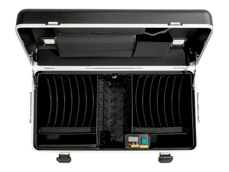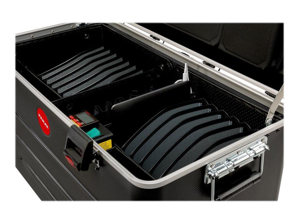 Mit durchdachtem Innenraumkonzept und hochwertigem Auftreten bietet der PARAPROJECT® Case N16 die perfekte Transport-und Ladelösung für bis zu 16 Tablets bis 12“, ein Master-Notebook sowie das notwendige Zubehör. Die Tablets finden ihren Platz in Slots aus formstabilen ConPearl® Material. Dabei sorgen der mit stoßdämpfendem Schaumstoff verkleidete Boden, die schlagzähe Außenschale aus X-ABS Kunststoff sowie der umlaufende Aluminiumrahmen an Deckel und Kofferkorpus für einen sicheren Transport und eine sichere Lagerung. Öffnungen im Deckel und aktive Lüfter im Elektronikfach stellen eine optimale Luftzirkulation sicher. Die Tablets werden über eine zentrale Stromversorgung geladen. Der PARAPROJECT® Case N16 ist dabei kompatibel mit allen Tablets und nicht USB-ladefähigen Tablet-PCs. Ein integrierter Ladetimer ist auf eine individuell gewünschte Ladezeit programmierbar. Im Lieferumfang enthalten sind Y-Adapter mit 2x IBM-Buchse (C5, 3-polig) sowie ein Y-Adapter mit 2x Euroflach-Buchse (C7, 2-polig). Der PARAPROJECT® Case N16 ist in den Farben silber oder schwarz erhältlich.