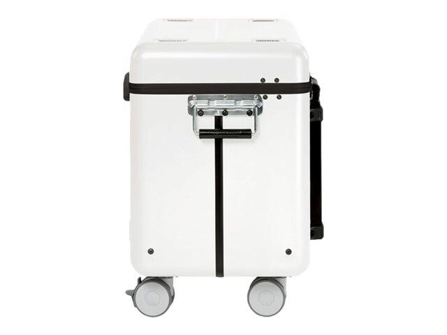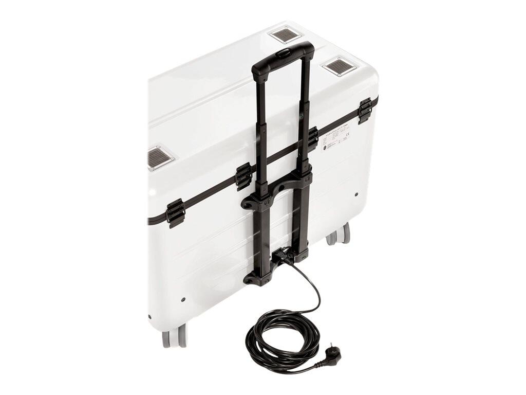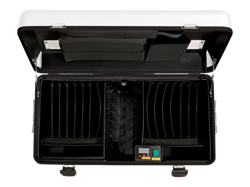 Mit durchdachtem Innenraumkonzept und hochwertigem Auftreten bietet der PARAPROJECT® Case N16 in weiß die perfekte Aufbewahrungs-und Ladelösung für bis zu 16 Tablets bis 12“, ein Master-Notebook sowie das notwendige Zubehör. Die Tablets finden ihren Platz in Slots aus formstabilen ConPearl® Material. Dabei sorgen der mit stoßdämpfendem Schaumstoff verkleidete Boden, die schlagzähe Außenschale aus ABS-Kunststoff sowie der umlaufende Aluminiumrahmen an Deckel und Kofferkorpus für einen sicheren Transport und eine sichere Lagerung der Tablets. Öffnungen im Deckel und aktive Lüfter im Elektronikfach stellen eine optimale Luftzirkulation sicher. Die Tablets werden über eine zentrale Stromversorgung geladen. Der PARAPROJECT® Case N16 ist dabei kompatibel mit allen Tablets und nicht USB-ladefähigen Tablet-PCs. Ein integrierter Ladetimer ist auf eine individuell gewünschte Ladezeit programmierbar. Im Lieferumfang enthalten sind Y-Adapter mit 2x IBM-Buchse (C5, 3-polig) sowie ein Y-Adapter mit 2x Euroflach-Buchse (C7, 2-polig). Der PARAPROJECT® Case N16 ist in den Farben weiß oder schwarz erhältlich.