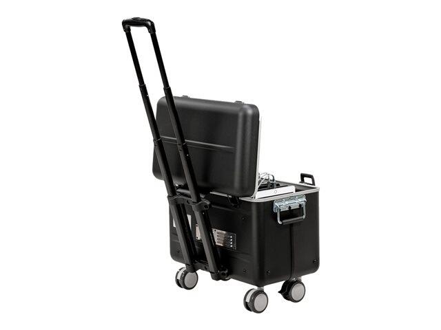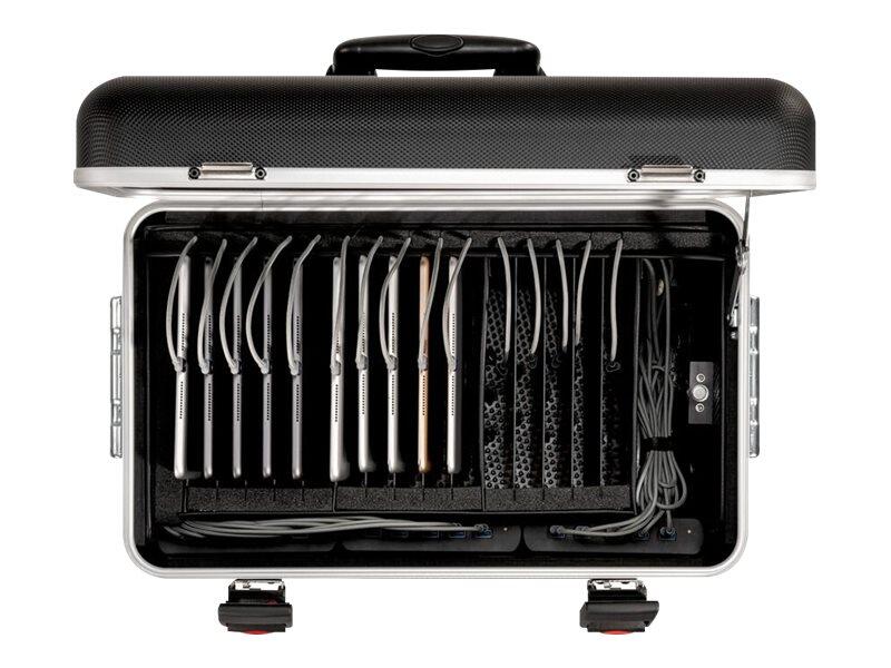 Der kompakte Lade- und Transportkoffer PARAPROJECT® MicroCase TC15 bietet Platz für bis zu 15 Tablets. Dank integrierter TwinCharge Module sind alle Endgeräte mit bis zu 11", die über USB-A oder USB-C® ladefähig sind, kompatibel. Zusätzlich verfügen die intelligenten TwinCharge Module über eine automatische Anpassung durch USB-PD (Power Delivery) und laden nach den QuickCharge Standards. Somit sind Ihre Geräte nach kürzester Zeit wieder einsatzfähig. Platz für Kleinteile wie Kabel und Stifte bietet der PARAPROJECT® MicroCase TC15 durch zwei im Kofferdeckel integrierte Taschen. Ein außen am Case integrierter Hauptschalter und ein Überspannungsschutz geben die notwendige Sicherheit im täglichen Einsatz. Der Premium Tabletkoffer ist aus hochwertigem schwarzem X-ABS verarbeitet und mit einem handlichen Trolleysystem mit vier Leichtlaufrollen, davon zwei feststellbar, ausgestattet. Der Koffer ist extrem widerstandsfähig und kann bequem von Einsatzort zu Einsatzort transportiert werden. Die Zahlenschlösser am Korpus bieten zusätzliche Sicherheit vor unbefugtem Zugriff. Zwei im Bodenbereich integrierte Axial-Lüfter sowie ein Temperatursensor sorgen zudem für eine optimale Luftzirkulation und schützen zuverlässig vor Überhitzung. Im Case sind 15 USB-A-Kabel auf Lightning Connector und LED Anzeige mit MFi-Zertifizierung, Boost ChargeTM und Nylon-Verstärkung vorinstalliert.