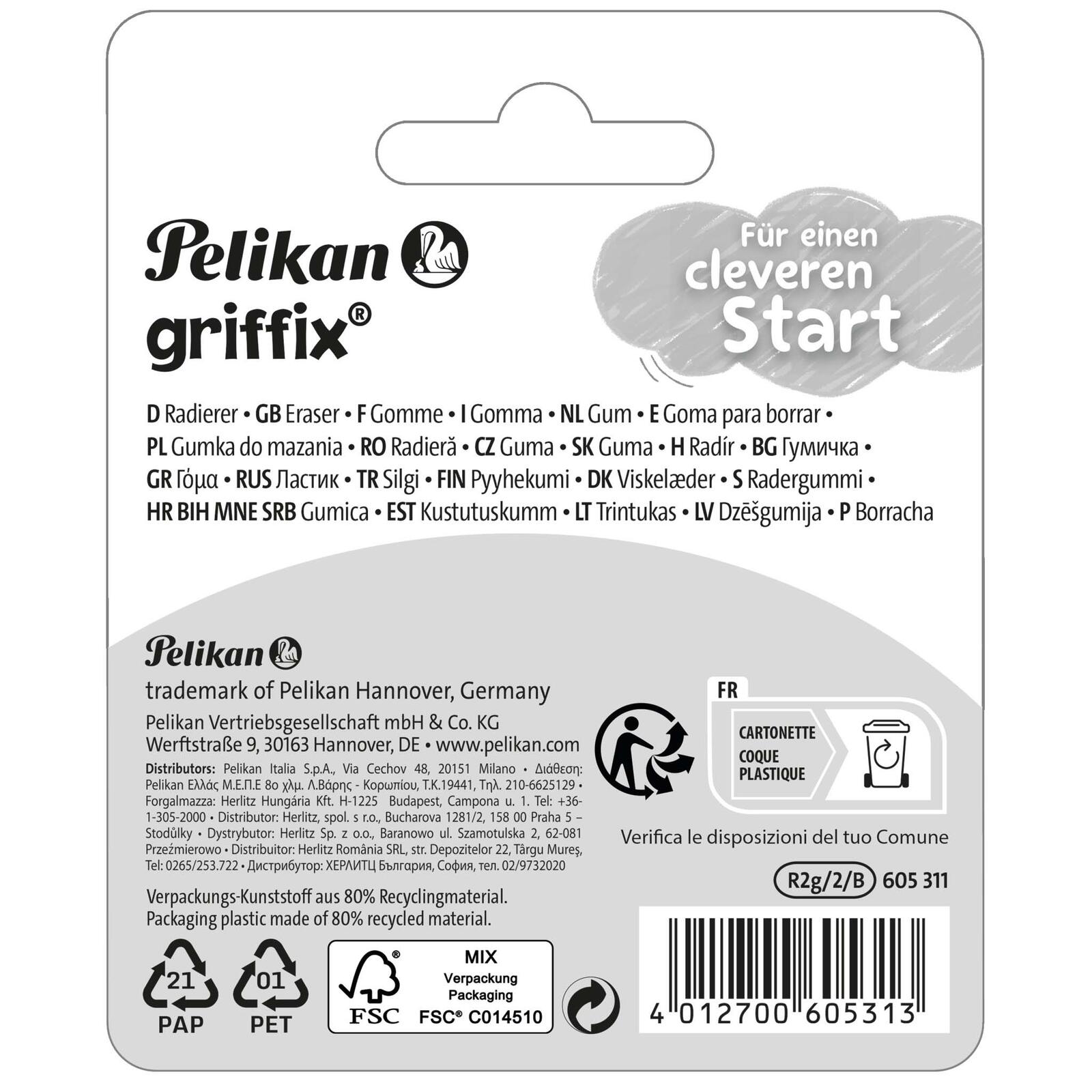 Der Pelikan griffix® Radiergummi in blau/weiß ist die ideale Ergänzung für jeden Schreibtisch. Dieser hochwertige Radiergummi wurde speziell für die Verwendung mit Bleistiften entwickelt und bietet eine hervorragende Radierleistung. Das Material aus Kautschuk sorgt dafür, dass du mühelos und sauber Korrekturen vornehmen kannst, ohne dass das Papier beschädigt wird. Die ansprechende Farbkombination aus blau und weiß verleiht diesem Radiergummi nicht nur ein modernes Design, sondern macht ihn auch zu einem attraktiven Schreibutensil für Schüler und Studenten. Mit der praktischen Verpackungseinheit von zwei Stück bist du bestens ausgestattet, egal ob für die Schule, das Büro oder für kreative Projekte zu Hause. Der Pelikan griffix® Radiergummi ist nicht nur funktional, sondern auch langlebig. Durch die Verwendung von hochwertigem Kautschuk wird eine lange Lebensdauer gewährleistet, sodass du lange Freude an diesem Produkt hast. Zudem liegt er angenehm in der Hand und ermöglicht ein präzises Arbeiten. Egal, ob du Notizen machst, Zeichnungen anfertigst oder einfach nur deine Gedanken festhältst, der Pelikan griffix® Radiergummi ist der perfekte Begleiter für all deine Schreibbedürfnisse. Mit diesem Radiergummi bringst du Ordnung in deine Unterlagen und kannst jederzeit spontane Änderungen vornehmen, ohne Spuren zu hinterlassen.Technische Daten