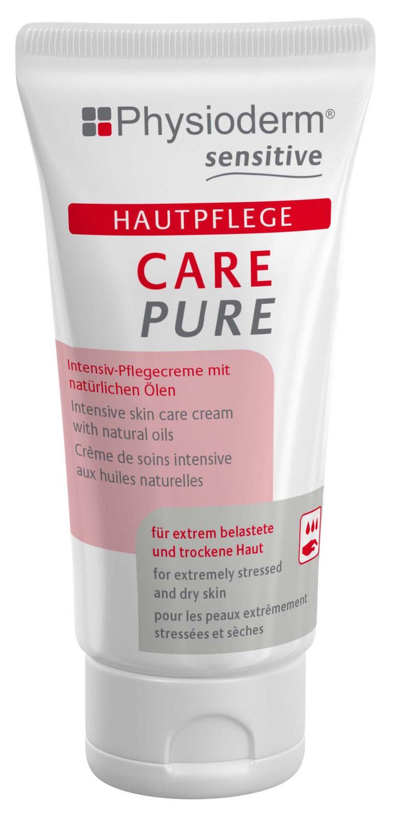 Die Physioderm® Hautschutzcreme CARE PURE ist speziell für extrem belastete und sehr trockene Haut entwickelt worden. Mit einem Inhalt von 50 ml bietet sie eine gezielte Pflege, die die Haut mit Feuchtigkeit versorgt und unterstützt, ihre natürliche Schutzfunktion zu erhalten. Die Creme ist besonders geeignet für beanspruchte Hauttypen, die intensive Pflege benötigen.