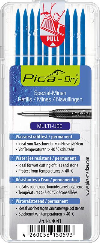 Die Pica Dry Wasserstrahl Ersatzminen sind speziell für den Tieflochmarker-Bleistift konzipiert und bieten mit einer Strichstärke von 2,8 mm eine präzise und gut sichtbare Markierung in Blau. Diese Minen sind ideal geeignet für das Nass-Schneiden von Fliesen und Stein, da sie wasserresistent und chloridfrei sind. Dadurch gewährleisten sie eine zuverlässige und langlebige Kennzeichnung auch unter anspruchsvollen Bedingungen.