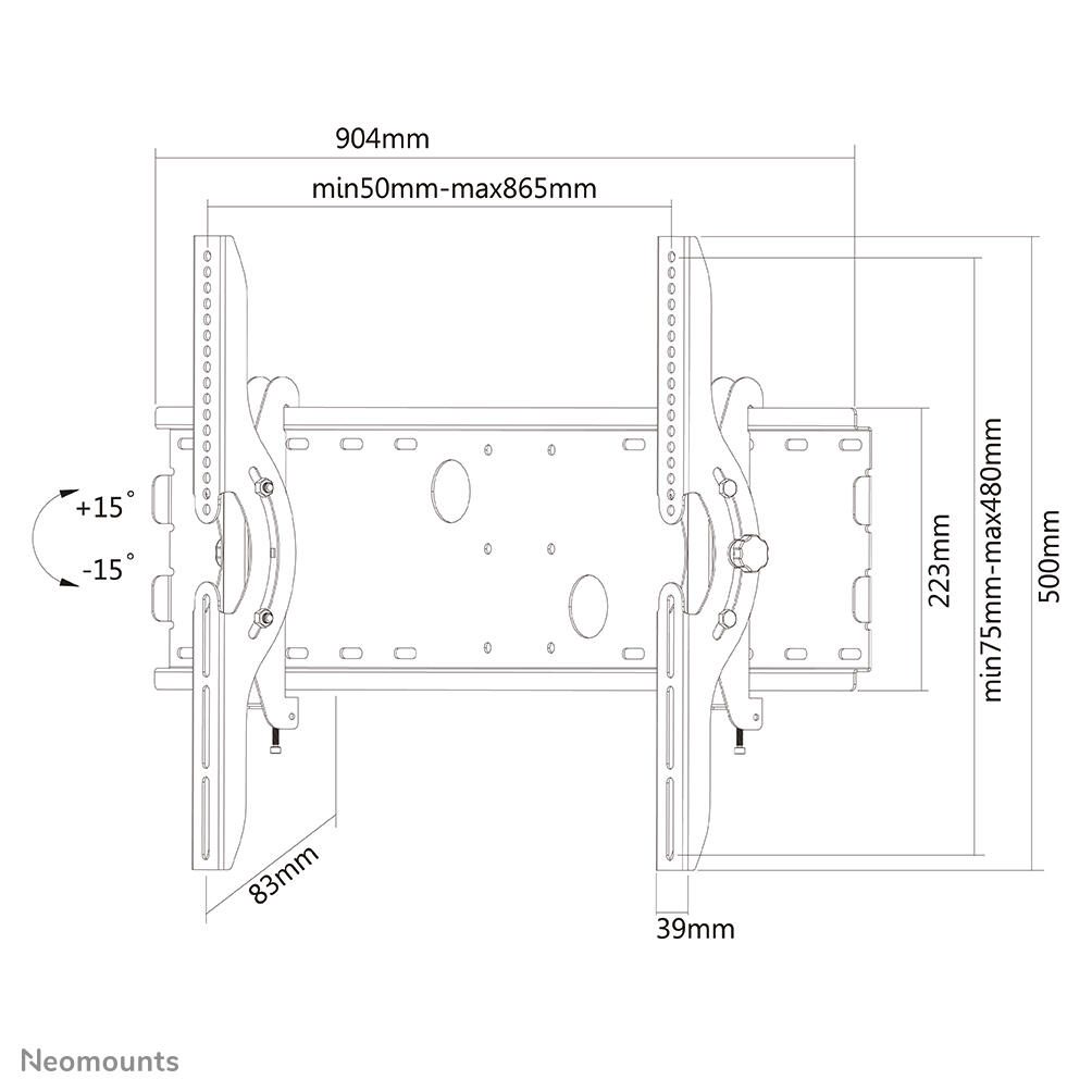 Neomounts Wandhalterung, Modell PLASMA-W200BLACK ist eine 30° neigbare Wandhalterung für Flachbildschirme und Flachbild-Fernseher bis 85" (216 cm). Diese Halterung ist eine gute Wahl, wenn Sie die ultimative Flexibilität beim Fernsehen mit Flachbildschirm haben wollen. Neomountss Neigungstechnologie (30°) ermöglicht die Änderung auf jeden Betrachtungswinkel, um vollumfänglich die Möglichkeiten des Flachbildschirms zu nutzen. Die Tiefe dieser Halterung ist 70 mm. Neomounts PLASMA-W200BLACK eignet sich für Bildschirme bis 85" (216 cm). Die Tragfähigkeit dieses Produkt ist geeignet für einen 100 kg Bildschirm. Die Wandhalterung ist geeignet für Bildschirme mit VESA 200x200 bis 865x480 mm Lochmuster. Verschiedene andere Lochmuster können, unter Verwendung von Neomountss VESA-Adapterplatten, abgedeckt werden. Erstellen Sie ein sauberes Ambiente für Ihren Flachbildfernseher im Wohnzimmer, Schlafzimmer oder Heimkino. Das benötigte Befestigungsmaterial ist im Lieferumfang enthalten..