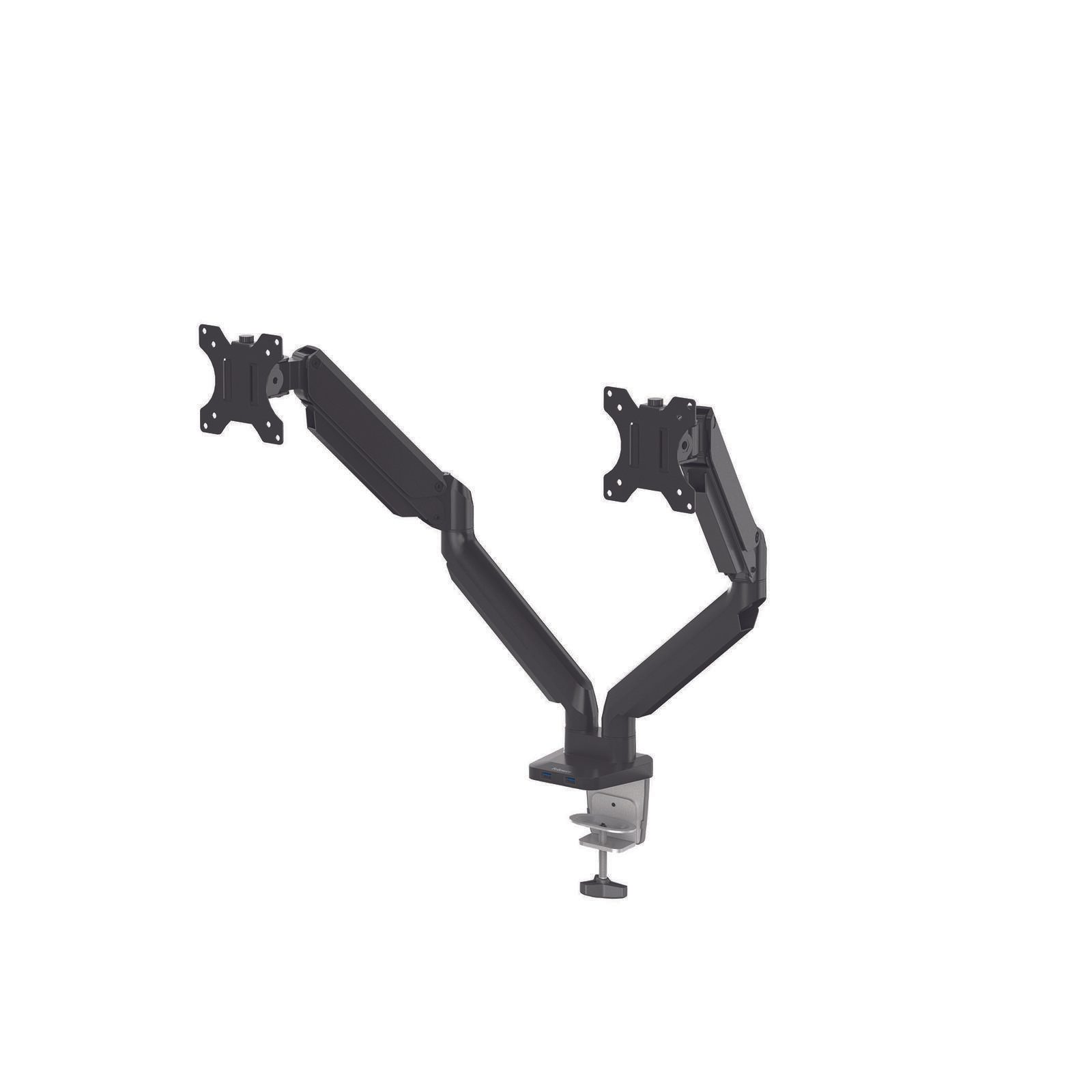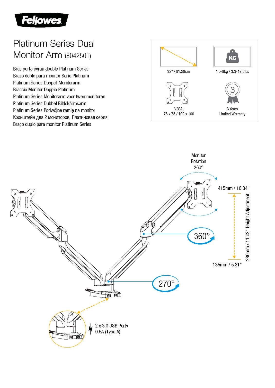 Die Fellowes Monitor-Halterung Platinum Dual in elegantem Schwarz bietet eine optimale Lösung für die Montage von zwei Monitoren und schafft somit einen aufgeräumten und ergonomischen Arbeitsplatz. Hergestellt aus hochwertigem Metall, vereint diese Halterung Stabilität und Langlebigkeit. Mit einem Gewicht von 5,1 kg und einer maximalen Tragfähigkeit von 9,07 kg pro Monitor ist sie ideal für Displays mit einer Größe von bis zu 68,6 cm (27 Zoll) geeignet.
