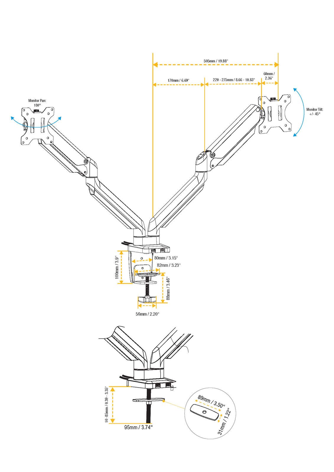 Ein herausragendes Merkmal dieser Halterung ist der integrierte 2-Port USB-Hub, der Ihnen den Zugriff auf USB-Anschlüsse direkt an der Basis ermöglicht. Dies erleichtert das Anschließen von Peripheriegeräten und trägt zur Reduzierung von Kabelsalat bei. Die Halterung unterstützt sowohl Tischmontage über eine Klemme als auch Tischbohrungen, was Ihnen Flexibilität bei der Installation bietet.