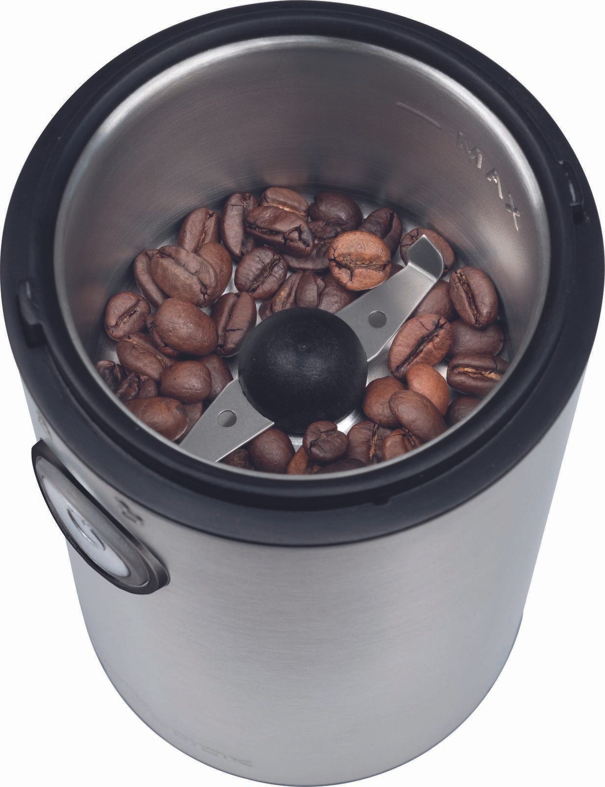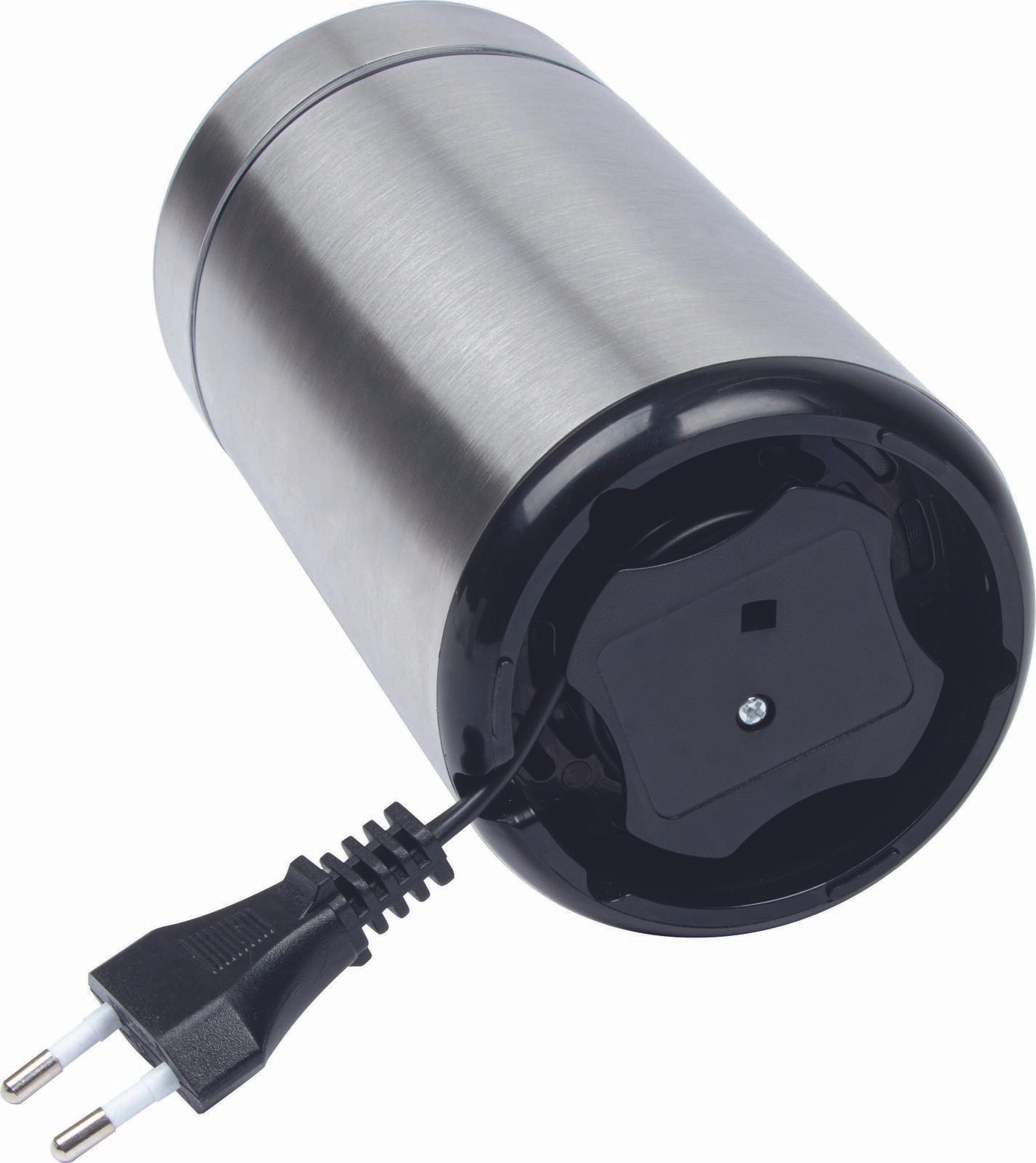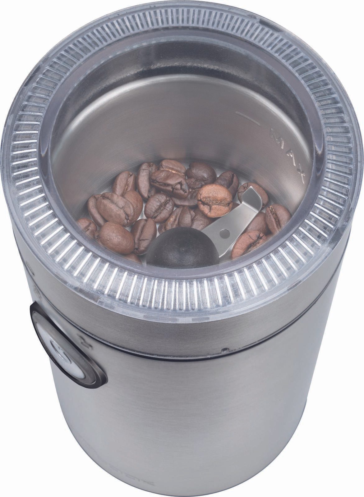 Die ProfiCook PC-KSW 1216 Kaffeemühle in elegantem Silber vereint Funktionalität und modernes Design in einem kompakten Gerät. Mit einem Fassungsvermögen von 40,0 g bietet sie ausreichend Platz für deine frisch gemahlenen Kaffeebohnen, ideal für die Zubereitung von aromatischem Kaffee für dich und deine Gäste. Die hochwertige Verarbeitung und die ansprechende Farbgebung machen diese Kaffeemühle zu einem stilvollen Accessoire in deiner Küche. Die Kaffeemühle ist mit einem 2-fach Edelstahlschlagmesser ausgestattet, das für eine gleichmäßige und präzise Mahlung sorgt. So kannst du den Mahlgrad individuell anpassen und die perfekte Konsistenz für deinen Kaffee erreichen. Der Deckel mit Sichtfenster ermöglicht es dir, den Mahlvorgang jederzeit zu beobachten und sicherzustellen, dass deine Bohnen genau nach deinem Geschmack gemahlen werden. Sicherheit wird bei der ProfiCook PC-KSW 1216 großgeschrieben. Die integrierte Sicherheitsschaltung und der Sicherheitstaster verhindern ungewollte Bedienungen und sorgen dafür, dass du die Kaffeemühle bedenkenlos nutzen kannst. Die praktische Kabelaufwicklung sorgt zudem für eine aufgeräumte und platzsparende Aufbewahrung, wenn die Mühle nicht in Gebrauch ist. Die ProfiCook PC-KSW 1216 Kaffeemühle ist nicht nur ein leistungsstarkes Küchengerät, sondern auch ein stilvolles Element, das deine Kaffeekultur auf ein neues Level hebt. Genieße den vollmundigen Geschmack frisch gemahlenen Kaffees und bereite dir unvergessliche Kaffeemomente in deinem Zuhause.Technische Daten