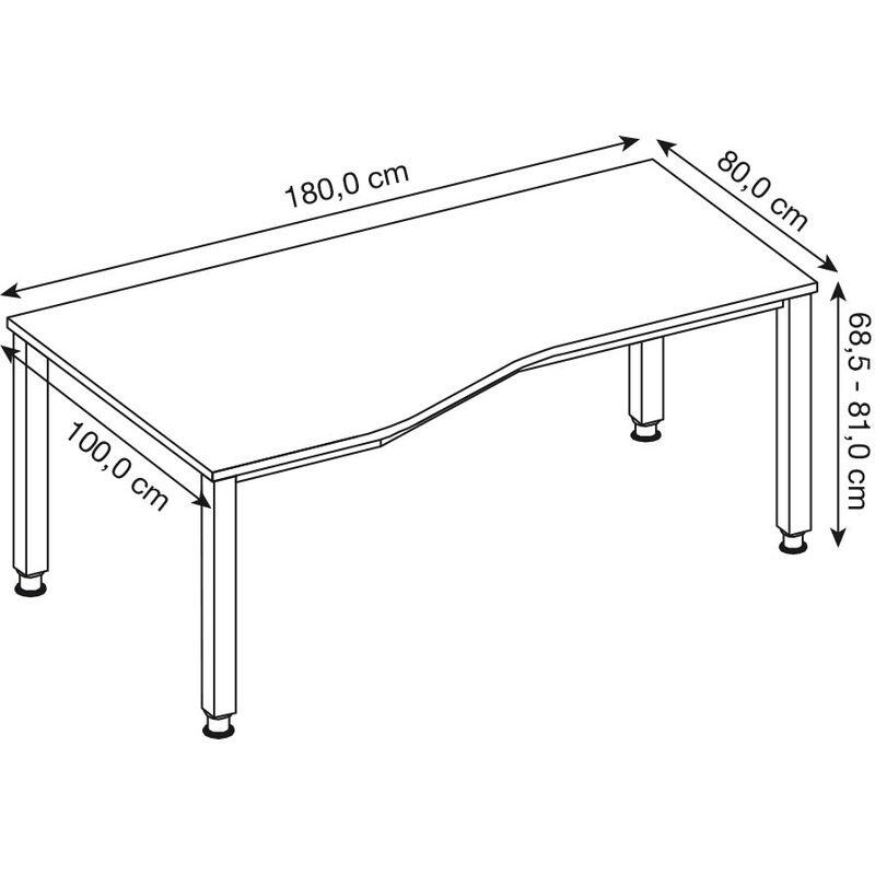 Der HAMMERBACHER VQS18/3/S ist ein eleganter und funktionaler höhenverstellbarer Schreibtisch, der sich perfekt für moderne Arbeitsumgebungen eignet. Mit einer Höhenverstellung von 68,5 bis 81 cm bietet dieser Schreibtisch Ihnen die Flexibilität, die ideale Position für Ihre individuellen Bedürfnisse zu finden. Die Tischplatte aus hochwertiger Spanplatte in ansprechendem Ahorn-Farbton sorgt für eine warme und einladende Atmosphäre in jedem Raum. Das stabile Gestell aus robustem Stahl in silberner Farbe garantiert eine hohe Standfestigkeit und Langlebigkeit. Das 4-Fuß-Gestell bietet zusätzlichen Halt und ermöglicht eine sichere Nutzung, egal ob im Büro oder im Homeoffice. Die trapezförmige Konstruktion des Schreibtisches verleiht ihm nicht nur eine moderne Optik, sondern sorgt auch für eine optimale Raumnutzung. Ein weiterer Vorteil des HAMMERBACHER VQS18/3/S ist die einfache Handhabung der Höhenverstellung, die es Ihnen ermöglicht, zwischen sitzender und stehender Arbeitsweise zu wechseln. Dies fördert nicht nur eine gesunde Körperhaltung, sondern steigert auch Ihre Produktivität und Ihr Wohlbefinden während der Arbeit. Die klare Linienführung und das schlichte Design machen diesen Schreibtisch zu einem zeitlosen Möbelstück, das sich harmonisch in jede Einrichtung integrieren lässt. Ob für das Homeoffice, das Arbeitszimmer oder das Büro, der HAMMERBACHER VQS18/3/S ist die ideale Wahl für alle, die Wert auf Funktionalität und Stil legen. Genießen Sie die Vorteile eines höhenverstellbaren Schreibtisches und gestalten Sie Ihren Arbeitsplatz individuell und ergonomisch.Technische Daten