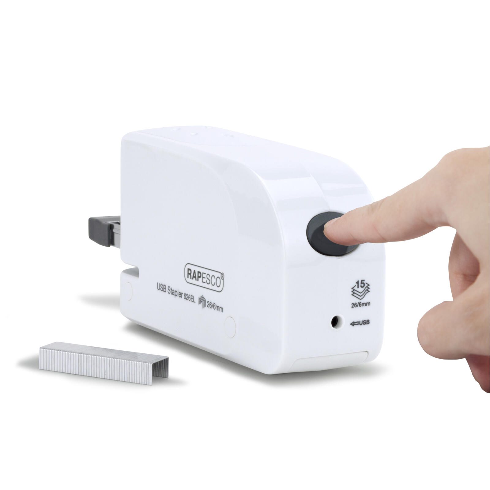 Der RAPESCO® Elektrohefter 626EL in Weiß ist ein elektrisches Heftgerät, das sich durch seine einfache Handhabung und zuverlässige Funktionalität auszeichnet. Er eignet sich für den täglichen Gebrauch im Büro und ermöglicht das schnelle und präzise Heften von Dokumenten. Das Gerät arbeitet mit einer geschlossenen Heftung, wodurch die Klammern sicher und sauber fixiert werden.