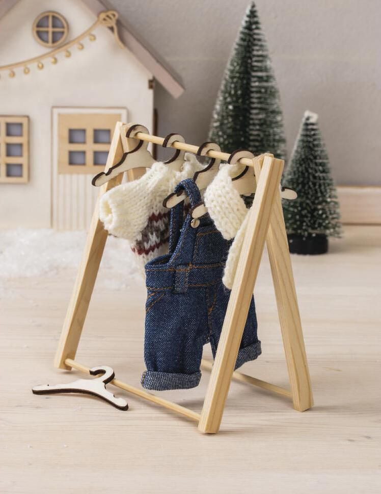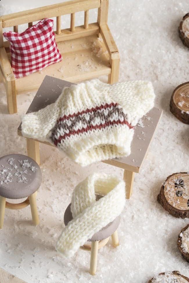 Die Kombination aus Pullover und Schal eignet sich besonders zur Verzierung von Bastelprojekten oder als kleines Accessoire für Dekorationen. Die Maße sind so gewählt, dass sie sich gut für kleinere Figuren oder als detailreiche Ergänzung in kreativen Arbeiten eignen. Das Material Polyester gewährleistet eine angenehme Haptik und eine gute Formbeständigkeit.