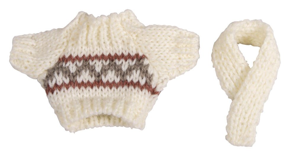 - Besonderheiten: Größe des Strickpullovers „Lasse“ 8,5x5,5 cm (BxH), Schal ca. 3x6 cm (BxH)