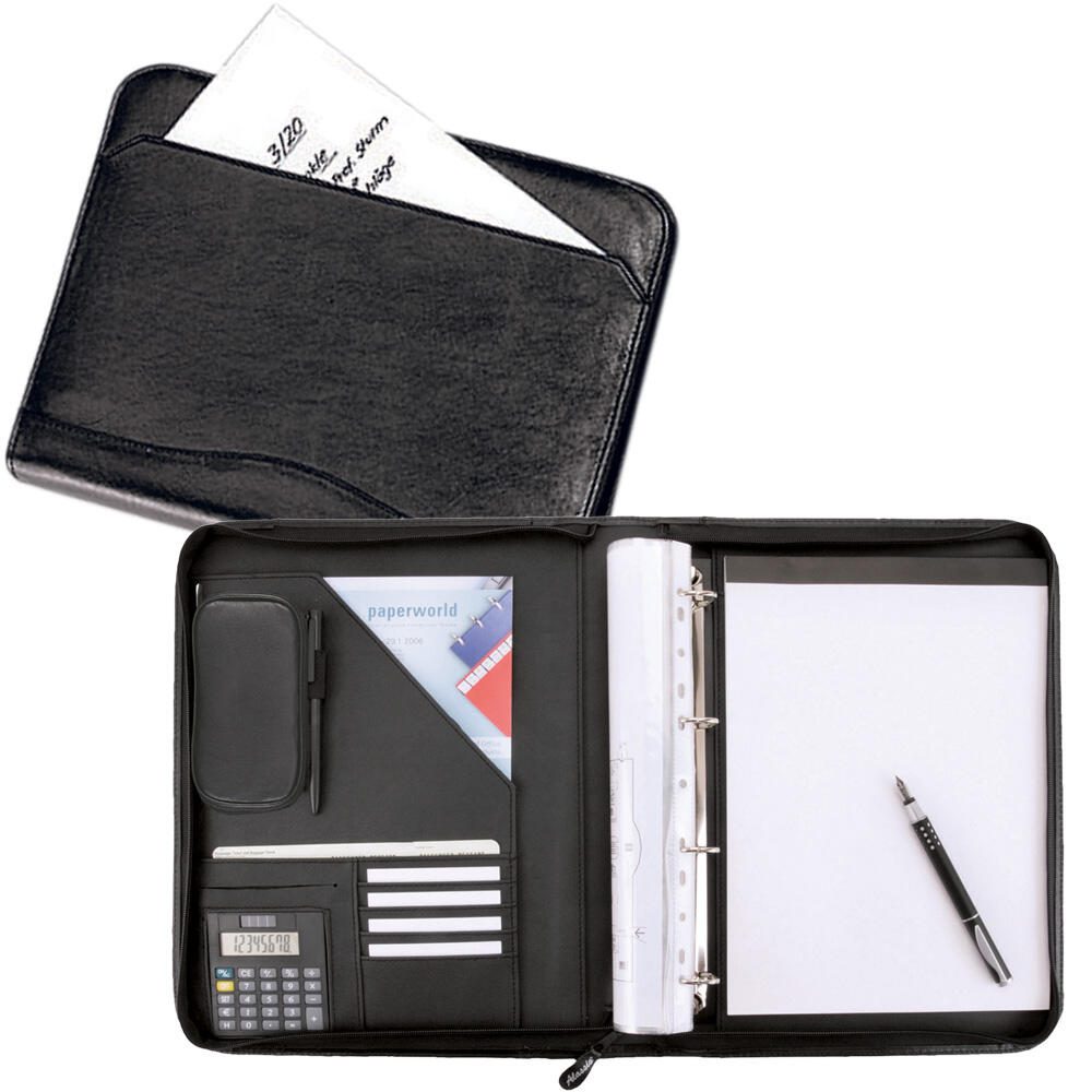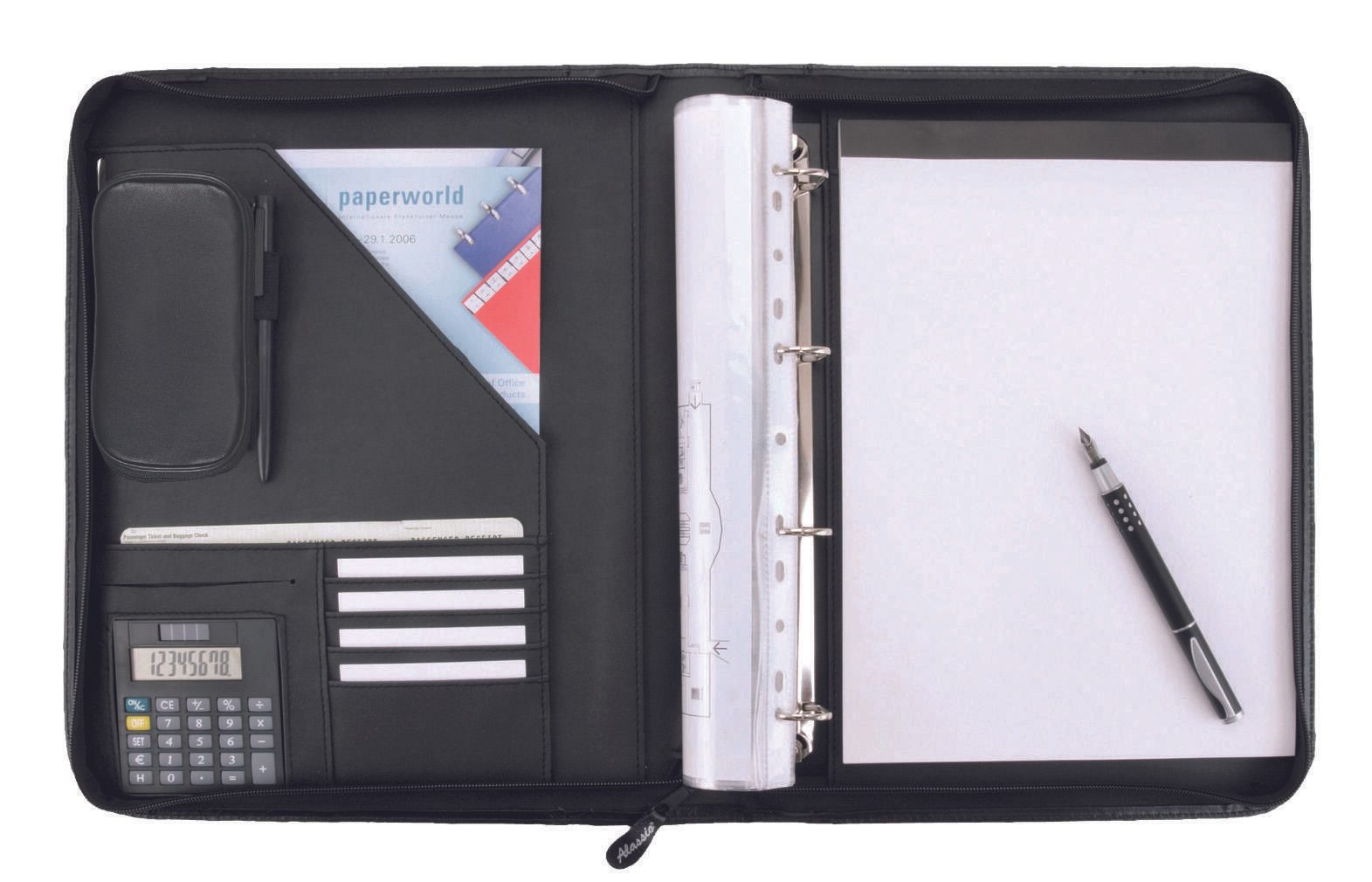 - Eigenschaften: mit herausnehmbarer Ringmechanik, mit Außentasche, mit Schreibblock, mit Taschenrechnerhalter