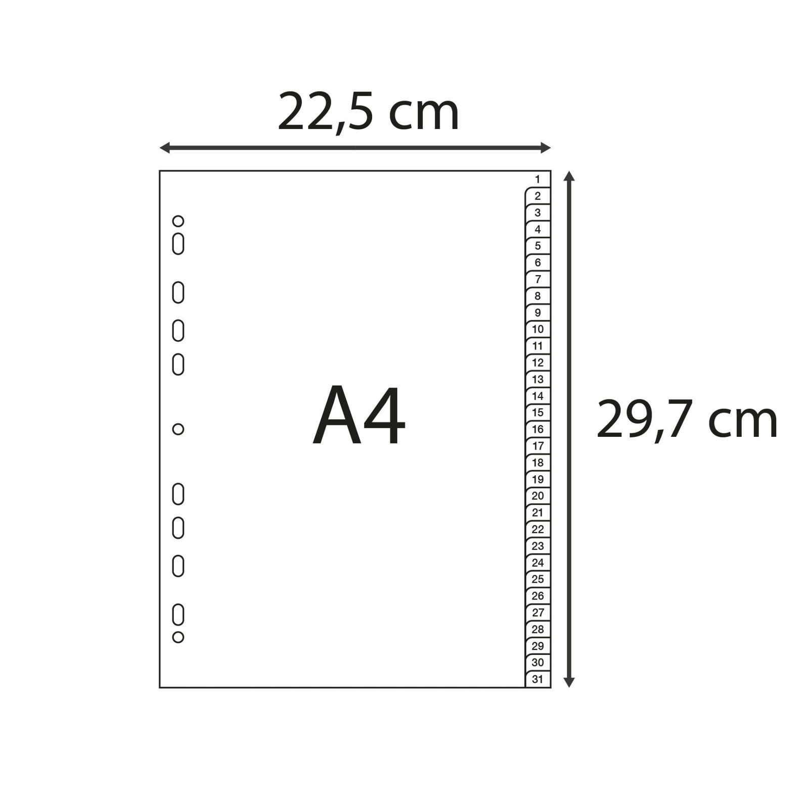 Das Register ist in einem eleganten Grauton gehalten und passt perfekt in jeden Ordner. Hergestellt aus hochwertigem Polypropylen (PP) ist es nicht nur langlebig, sondern auch widerstandsfähig gegenüber Abnutzung und Feuchtigkeit. Das Vollformat sorgt dafür, dass DIN A4-Dokumente optimal eingelegt werden können, ohne dass sie überstehen oder knicken. Die geprägten Taben 1 bis 31 sind klar lesbar und ermöglichen eine schnelle Navigation durch deine Unterlagen.