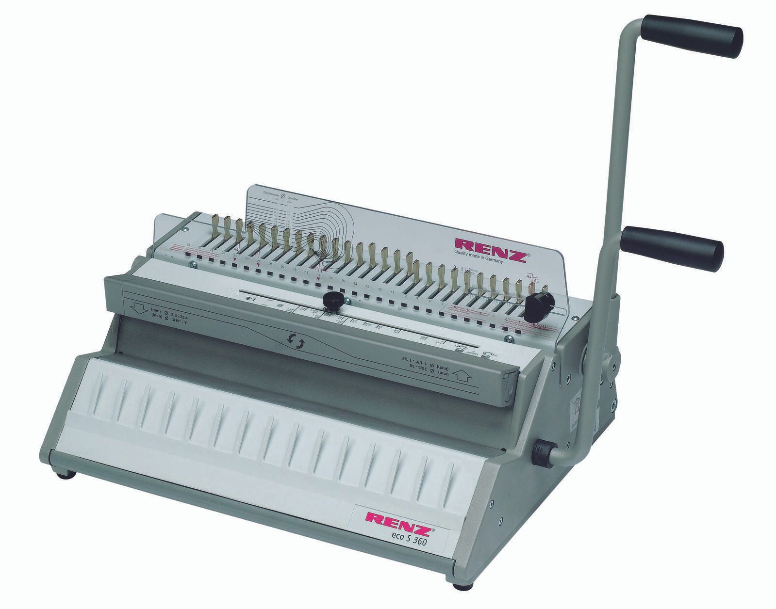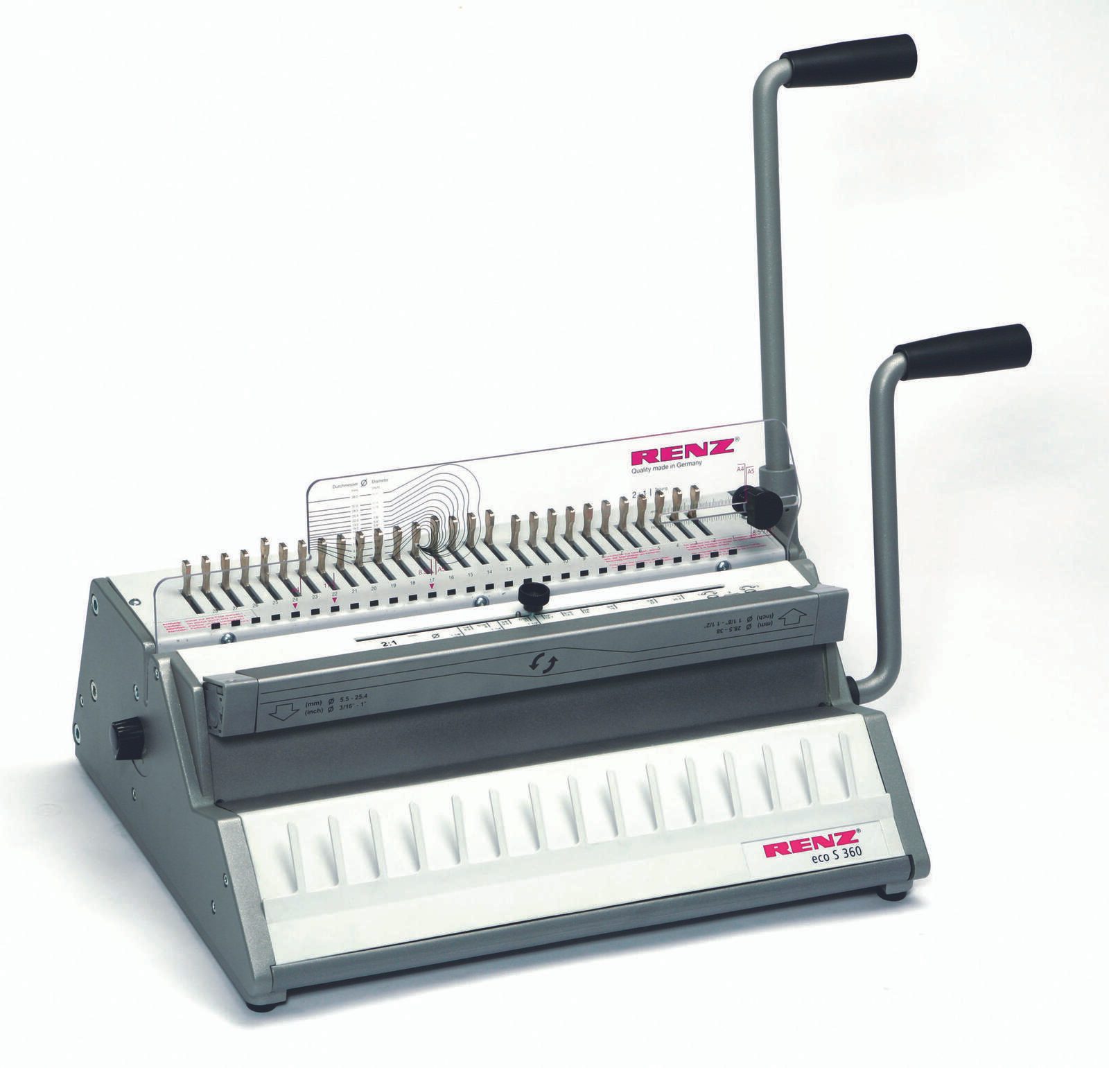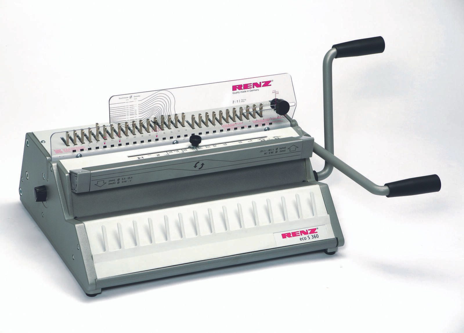 Das Renz Drahtbindegerät Eco S 360 ist ein zuverlässiges Bindesystem in grau, hergestellt von Renz, einem renommierten Hersteller. Mit einer Teilung von 2:1 können problemlos 23 Ringe auf ein A4-Format gebunden werden.