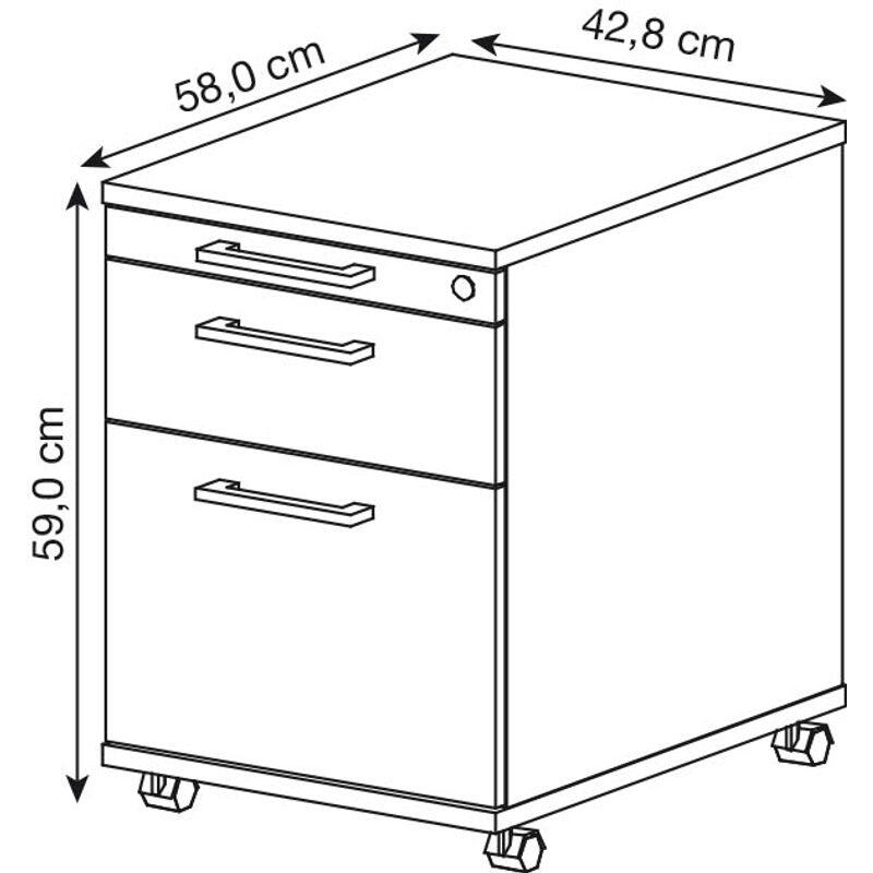 Der HAMMERBACHER Rollcontainer VAC20/W/W/BS in elegantem Weiß ist die perfekte Ergänzung für dein Büro oder Home Office. Mit seiner kompakten Größe von 42,8 x 58,0 x 59,0 cm bietet dieser Rollcontainer nicht nur ausreichend Stauraum, sondern passt auch ideal unter jeden Schreibtisch. Die Ausführung mit Selbsteinzug und Soft-Stopp sorgt dafür, dass die Schublade sanft und leise schließt, was eine angenehme Arbeitsatmosphäre schafft. Gefertigt aus hochwertiger Spanplatte, zeichnet sich der Rollcontainer durch seine Langlebigkeit und Stabilität aus. Der Bügelgriff aus Stahl sorgt für einen sicheren und komfortablen Griff, sodass du den Container mühelos bewegen kannst. Die weiße Farbgebung verleiht dem Möbelstück eine moderne und zeitlose Optik, die sich nahtlos in jede Einrichtung einfügt. Mit einem Fach bietet der Rollcontainer ausreichend Platz für wichtige Unterlagen, Büromaterialien oder persönliche Gegenstände. Die durchdachte Konstruktion ermöglicht es dir, alles Wichtige stets griffbereit zu haben und gleichzeitig für Ordnung zu sorgen. Der HAMMERBACHER Rollcontainer VAC20/W/W/BS ist nicht nur funktional, sondern auch ein stilvolles Möbelstück, das deinem Arbeitsbereich eine ansprechende Note verleiht. Entscheide dich für den HAMMERBACHER Rollcontainer VAC20/W/W/BS und genieße die Vorteile eines durchdachten und eleganten Designs, das sowohl Praktikabilität als auch Ästhetik vereint.Technische Daten