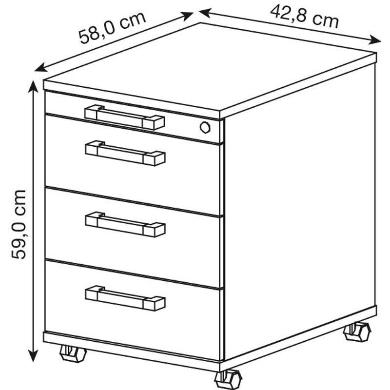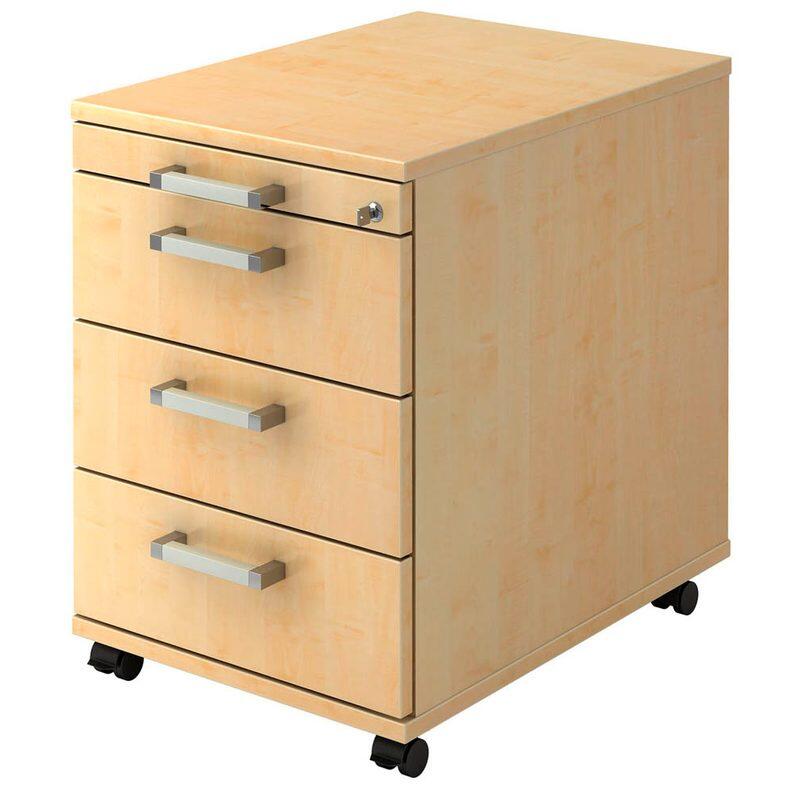 Der Rollcontainer besteht aus hochwertiger Spanplatte und ist in einem attraktiven ahorn Farbton gehalten. Dank seiner Maße von 42,8 x 58,0 x 59,0 cm passt er unter nahezu jeden Schreibtisch und bietet dennoch ausreichend Stauraum für deine Unterlagen und Büromaterialien.