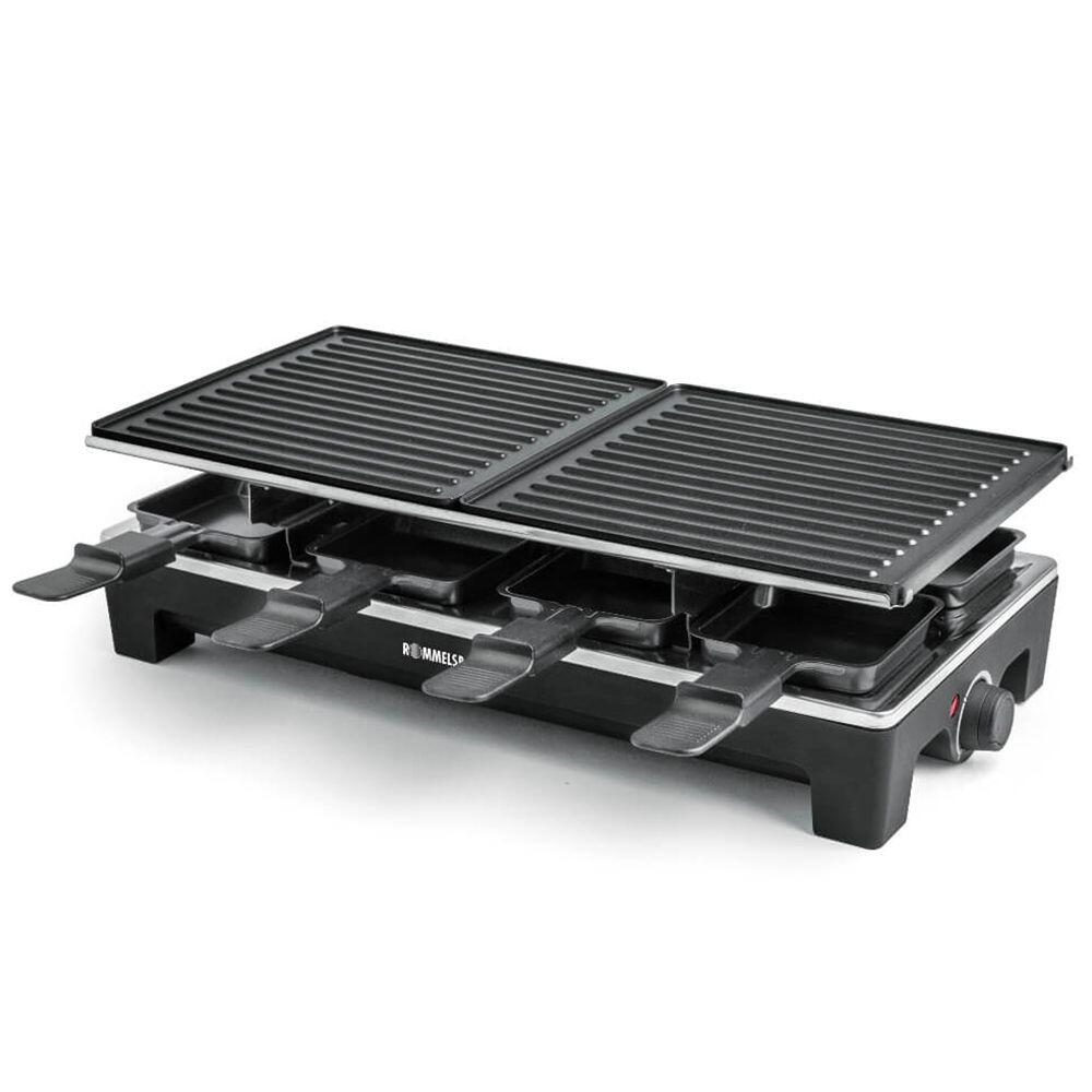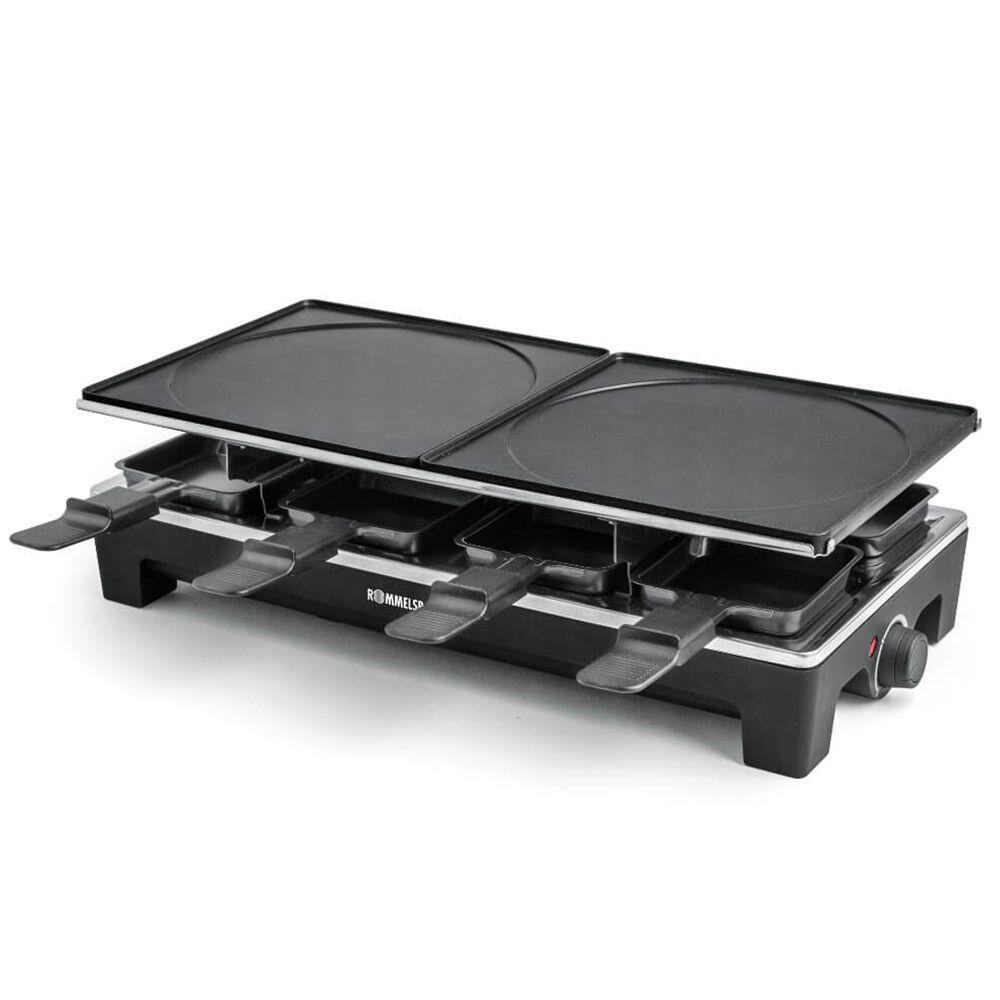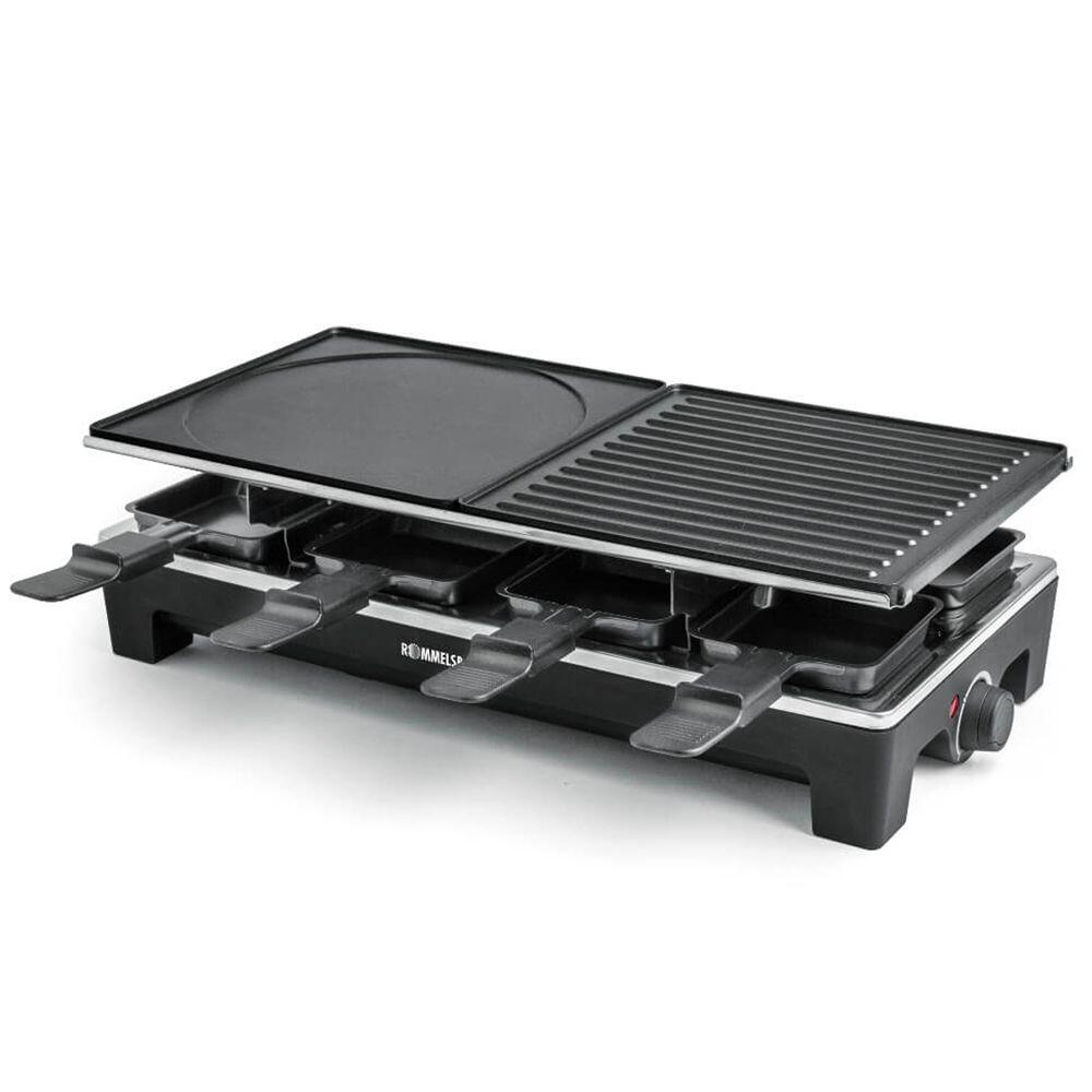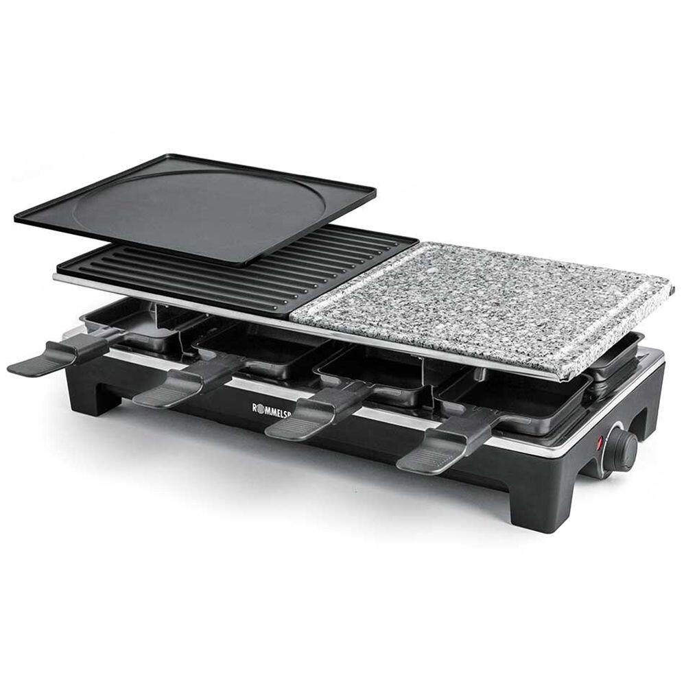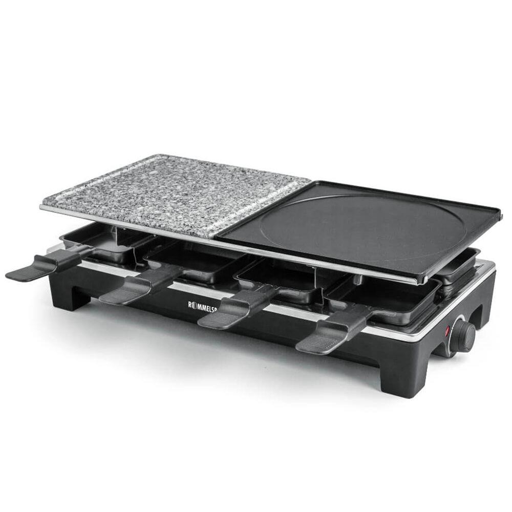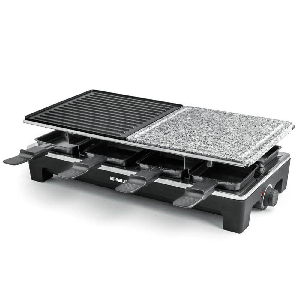 Dieses hochwertige Raclette aus dem Hause ROMMELSBACHER garantiert künftig noch mehr kulinarische Vielfalt beim Raclette-Grillen. Die verschiedenen Wechselplatten lassen sich frei kombinieren, so ist man flexibel in Auswahl und Kombination der Grilloberflächen. Ob auf den beiden hochwertig beschichteten Wendeplatten (eine Seite geriffelt, die andere glatt) oder auf dem Naturstein – für jeden Geschmack ist das Richtige dabei. Auf der Granitplatte wird direkt auf dem Stein gegrillt. Dieses Material ist kratz- und schnittfest und liefert außergewöhnlich gute Grillergebnisse, egal ob für Fleisch, Fisch oder Gemüse. Die umlaufende Saftrinne nimmt überschüssiges Fett oder Flüssigkeiten auf und ermöglicht fettarmes Grillen. Die beiden Alu-Druckguss Grillplatten können beidseitig benutzt werden. Ob Grillen mit typischen Grillstreifen oder lieber im Teppanyaki Style auf glatter Platte – alles ist möglich. Die 8 antihaftbeschichten Pfännchen lassen sich, je nach Geschmack, als Raclette-Pfännchen für Käse oder zum Überbacken von leckeren Snacks und Beilagen nutzen. Eine beliebte und vielseitige Raclette Version, für ganzjährigen Grillspaß bei Tisch.