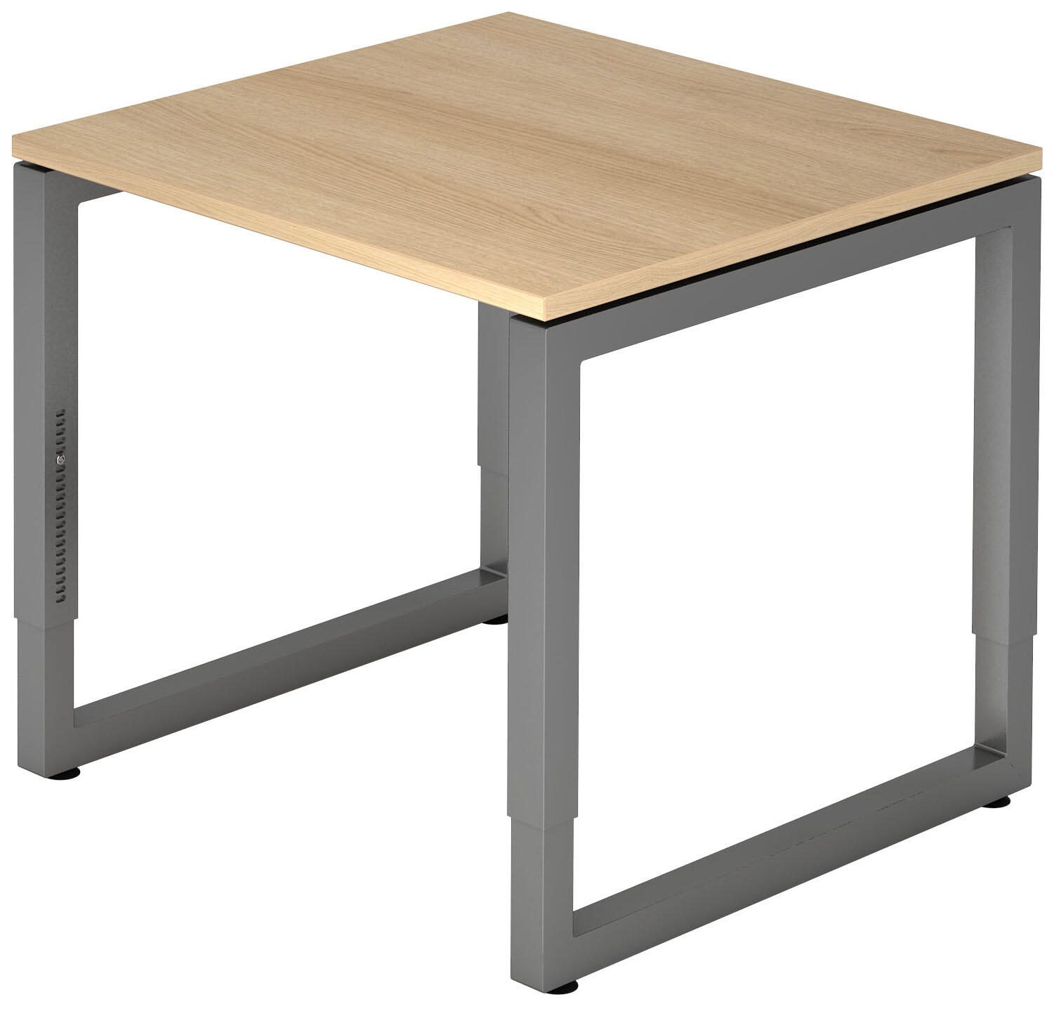 Der HAMMERBACHER höhenverstellbare Schreibtisch VRS08/E/G eiche vereint funktionales Design mit modernem Komfort. Die Tischplatte aus hochwertiger Spanplatte in ansprechender Eiche-Optik sorgt für eine warme und einladende Atmosphäre in Ihrem Arbeitsbereich. Das robuste Stahlgestell in elegantem Grafit bietet nicht nur Stabilität, sondern auch eine stilvolle Ergänzung zu jeder Einrichtung. Mit den kompakten Maßen von 80 cm x 80 cm x 65 cm passt dieser Schreibtisch ideal in kleine Büros oder Home-Offices und bietet dennoch ausreichend Platz für Ihre Arbeitsutensilien. Das innovative Kufen-Gestell ermöglicht eine stufenlose Höhenverstellung, wodurch Sie zwischen Sitzen und Stehen wechseln können. Diese Flexibilität fördert nicht nur Ihr Wohlbefinden, sondern trägt auch zu einer gesunden Körperhaltung bei, was besonders wichtig ist, wenn Sie lange Stunden am Schreibtisch verbringen. Die schlichte, rechteckige Form des Schreibtisches fügt sich harmonisch in verschiedene Raumkonzepte ein und lässt sich mühelos mit anderen Möbelstücken kombinieren. Der HAMMERBACHER Schreibtisch ist nicht nur funktional, sondern auch ein stilvolles Möbelstück, das Ihre Produktivität steigern kann. Profitieren Sie von der Kombination aus ansprechendem Design und praktischen Funktionen, die der HAMMERBACHER höhenverstellbare Schreibtisch VRS08/E/G eiche bietet. Sein durchdachtes Konzept macht ihn zu einer ausgezeichneten Wahl für alle, die Wert auf Ergonomie und Stil legen.Technische Daten