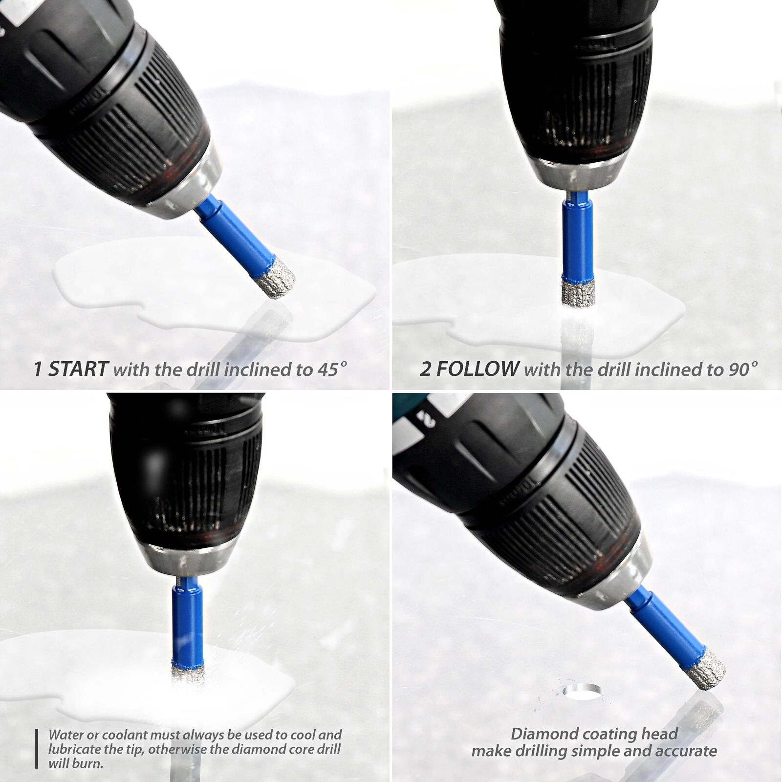 - Materialeignung: Fliesen, Glas, Granit, Kalk- und Sandsteine, Keramik, Marmor, Mauerwerk, Porzellan