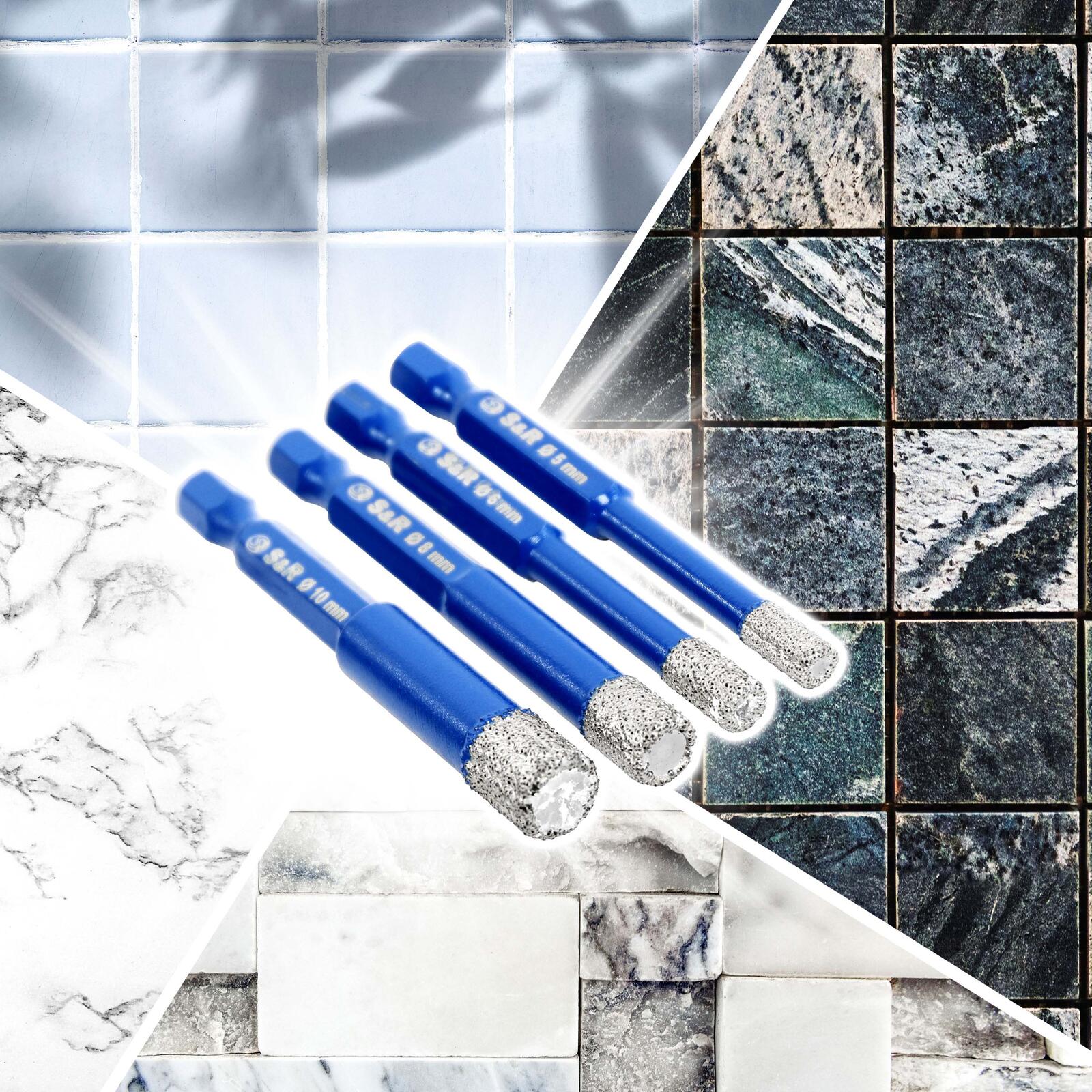 Das S&R Diamantbohrer-Set 4-tlg. bietet eine vielseitige und hochwertige Lösung für präzises Bohren in verschiedenen Materialien. Dieses Set umfasst vier Bohrer mit den Durchmessern 5, 6, 8 und 10 mm, die speziell für anspruchsvolle Werkstoffe wie Fliesen, Glas, Granit, Kalk- und Sandsteine, Keramik, Marmor, Mauerwerk sowie Porzellan entwickelt wurden. Die diamantbeschichteten Bohrköpfe gewährleisten eine besonders hohe Härte und Langlebigkeit, wodurch sie auch bei härtesten Oberflächen eine saubere und exakte Bohrung ermöglichen.