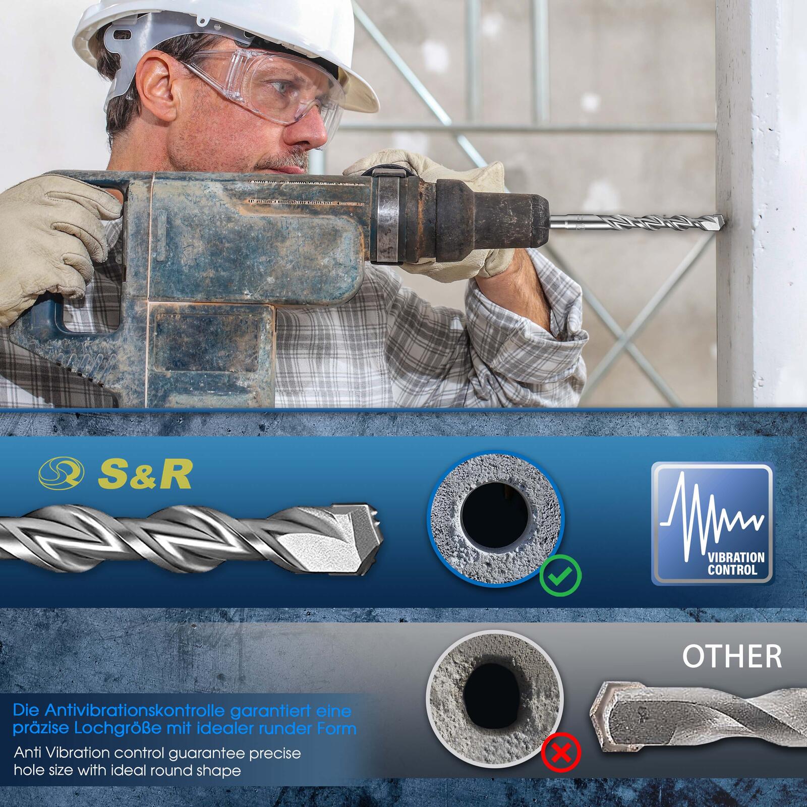 Das S&R Hammerbohr-Set SDS4 Plus, 7-teilig, bietet eine vielseitige und zuverlässige Lösung für anspruchsvolle Bohrarbeiten in Beton, Mauerwerk und Naturstein. Mit insgesamt sieben hochwertigen Hammerbohrern in den Größen 5x110mm, 6x110mm, 8x110mm, 6x160mm, 8x160mm, 10x160mm und 12x160mm deckt dieses Set ein breites Anwendungsspektrum ab und ermöglicht präzises und effizientes Arbeiten.