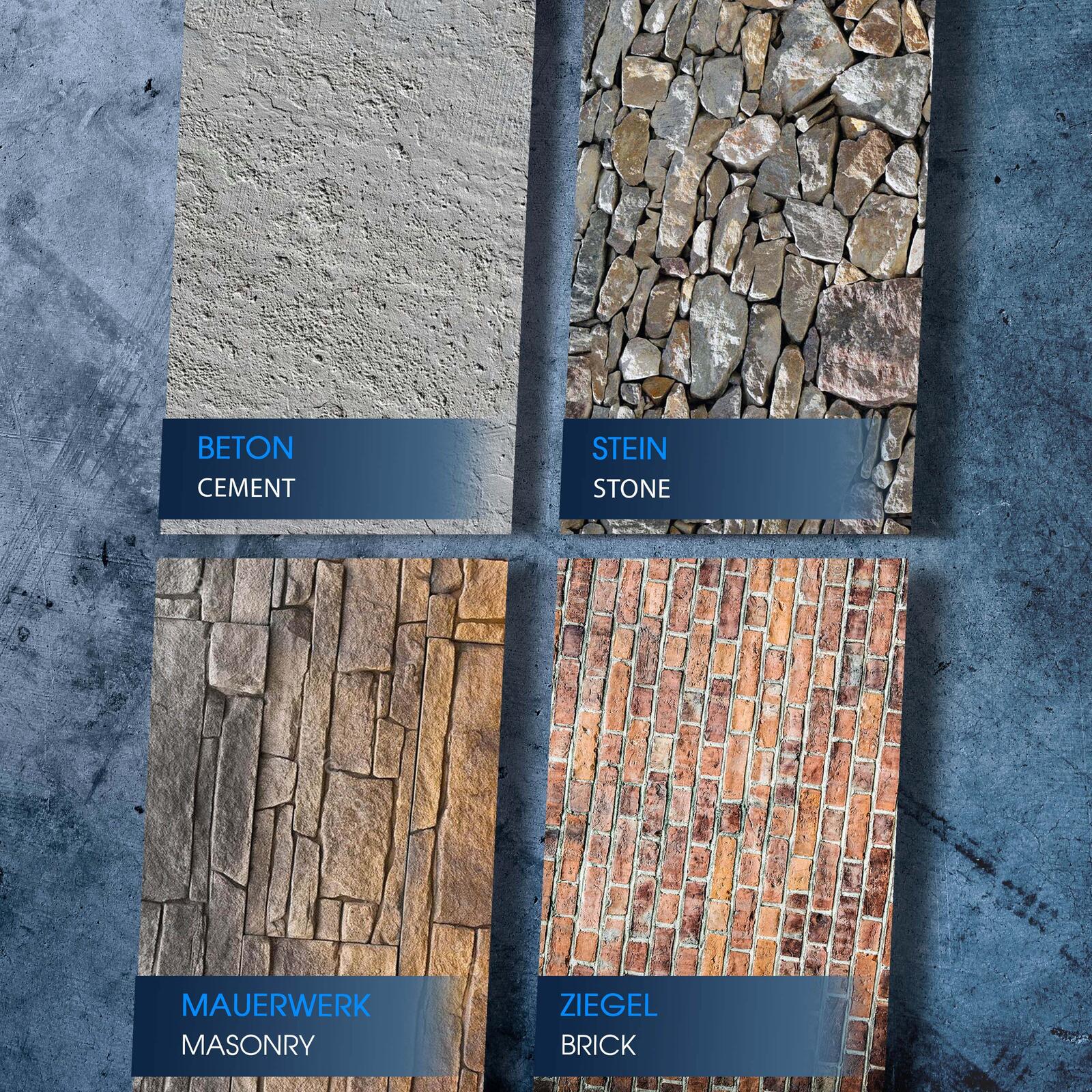 - Materialeignung: Beton, Mauerwerk, Naturstein