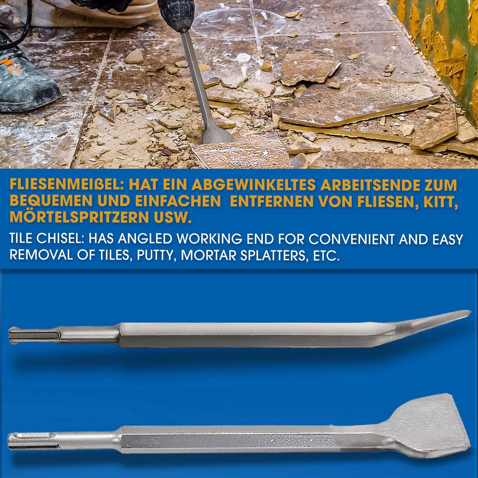 Die robuste Verarbeitung garantiert eine hohe Langlebigkeit und Widerstandsfähigkeit auch bei anspruchsvollen Einsätzen. Ob zum Entfernen von Fliesen, zum Aufbrechen von Beton oder zum Bearbeiten von Mauerwerk – das S&R Meißel-Set SDS-plus unterstützt Sie dabei, Ihre Arbeiten schnell und präzise auszuführen. Die durchdachte Auswahl der Meißeltypen ermöglicht es Ihnen, für jede Aufgabe das passende Werkzeug griffbereit zu haben.