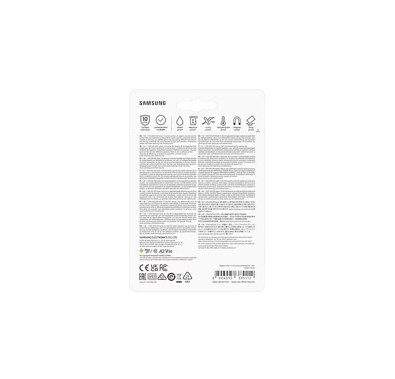 Wasserfest: bis zu 72 Stunden in 1 Meter tiefem Meerwasser. ² Temperaturbeständig: Betriebstemperaturen von -25°C bis 85°C, nicht in Betrieb: von -40°C bis 85°C. ³ Röntgensicher: bis zu 100 mGy, entspricht Röntgenscannern an Flughäfen. ⁴ Magnetresistent: bis zu 15.000 Gauss, was dem Magnetfeld eines Hochfeld-MRT entspricht. ⁵ Sturzsicher: übersteht Stürze aus bis zu 5 Metern Höhe. ⁶ Verschleißfrei: bis zu 10.000 Steckzyklen. * Die Prüfungen gelten für die microSD-Karte und enthalten nicht den Adapter. |