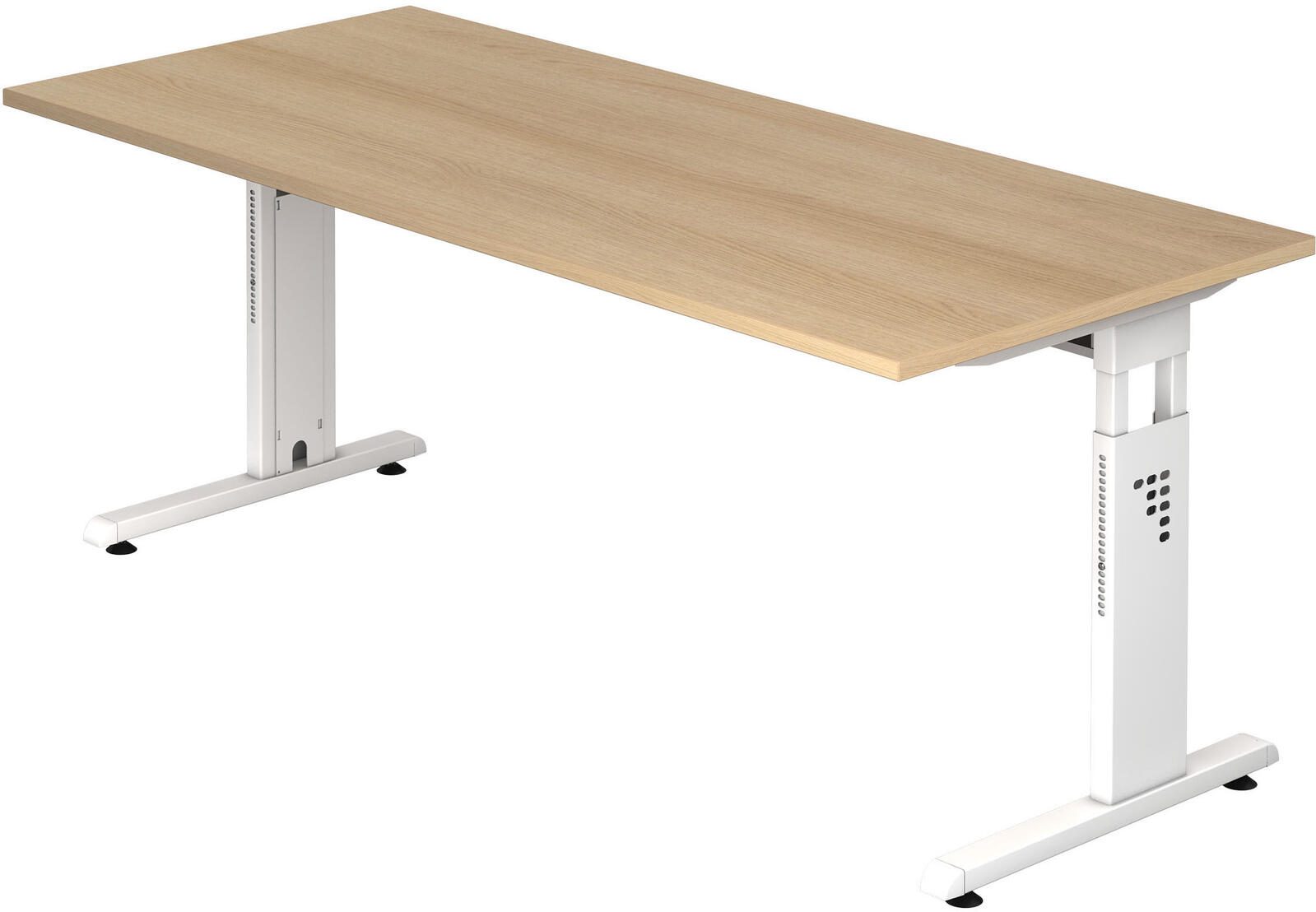 Der HAMMERBACHER höhenverstellbare Schreibtisch VOS19/E/W in eiche kombiniert Funktionalität mit ansprechendem Design. Die Tischplatte aus Spanplatte bietet eine robuste und pflegeleichte Oberfläche, die ideal für den täglichen Gebrauch ist. Das elegante C-Fuß-Gestell aus Stahl sorgt für Stabilität und Langlebigkeit, während die weiße Farbgebung des Gestells einen modernen Akzent setzt und sich harmonisch in verschiedene Einrichtungsstile einfügt. Mit den Maßen von 180 cm in der Breite, 80 cm in der Tiefe und einer Höhe von 65 cm passt dieser Schreibtisch perfekt in jedes Büro oder Arbeitszimmer. Die Möglichkeit, die Höhe des Schreibtisches individuell anzupassen, fördert eine ergonomische Sitzhaltung und unterstützt somit Ihre Gesundheit während langer Arbeitsstunden. Dies ist besonders vorteilhaft für Menschen, die viel Zeit am Schreibtisch verbringen, da es hilft, Rücken- und Nackenschmerzen vorzubeugen. Die ansprechende Eichenoptik verleiht dem Schreibtisch eine natürliche und warme Ausstrahlung, die eine angenehme Arbeitsatmosphäre schafft. Ob für das Home Office oder das professionelle Büro, dieser Schreibtisch bietet ausreichend Platz für Computer, Unterlagen und persönliche Gegenstände. Zusätzlich ist der Schreibtisch frei von Fächern oder Schüben, was Ihnen die Möglichkeit gibt, den Raum nach Ihren Wünschen zu gestalten und Ihre Arbeitsmittel optimal zu organisieren. Der HAMMERBACHER VOS19/E/W ist nicht nur ein praktisches Möbelstück, sondern auch ein stilvolles Element in Ihrer Einrichtung, das Funktionalität und Ästhetik vereint.