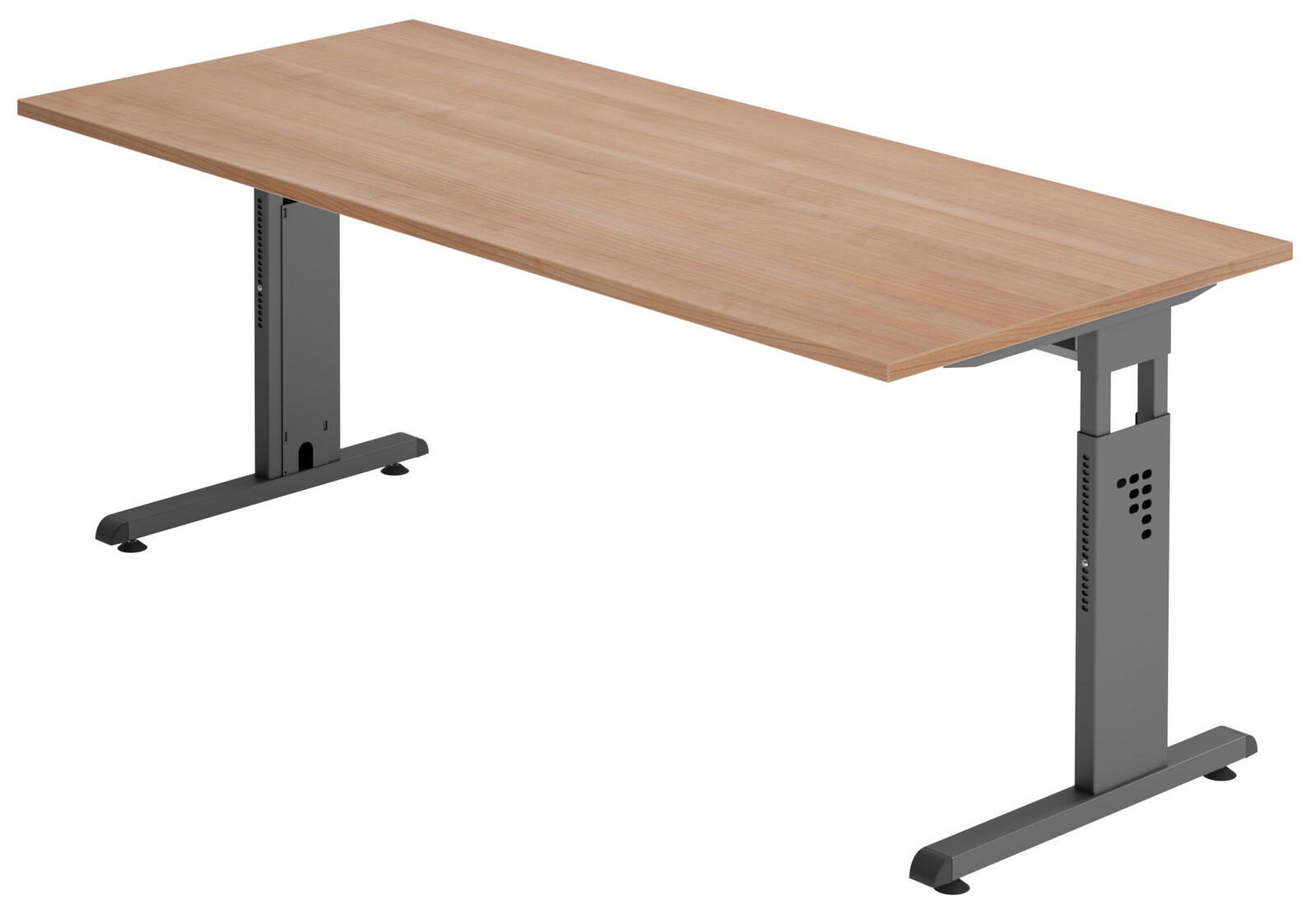 Der HAMMERBACHER höhenverstellbare Schreibtisch VOS19/N/G in edlem Nussbaum-Design vereint Funktionalität und Ästhetik auf harmonische Weise. Mit einer großzügigen Tischplatte aus Spanplatte, die eine Breite von 180 cm und eine Tiefe von 80 cm bietet, ist dieser Schreibtisch ideal für ein produktives Arbeitsumfeld, sei es im Homeoffice oder im Büro. Die Höhe des Tisches lässt sich flexibel von 65 cm anpassen, sodass Sie stets die optimale Sitz- oder Stehposition finden können, um Rückenbeschwerden vorzubeugen und Ihre Produktivität zu steigern. Das stabile C-Fuß-Gestell aus robustem Stahl in grafitfarbener Ausführung sorgt für eine hohe Standfestigkeit und Langlebigkeit. Die Kombination aus hochwertigem Material und durchdachtem Design verleiht dem Schreibtisch nicht nur eine moderne Optik, sondern auch eine ausgezeichnete Stabilität, die selbst bei intensiver Nutzung gewährleistet ist. Die elegante Nussbaumfarbe der Tischplatte bringt Wärme und Stil in jeden Raum und lässt sich mühelos mit verschiedenen Einrichtungsstilen kombinieren. Ob im klassischen oder modernen Ambiente, dieser Schreibtisch wird zum Blickfang und fördert gleichzeitig eine angenehme Arbeitsatmosphäre. Zusätzlich zeichnet sich der HAMMERBACHER Schreibtisch durch seine praktische Funktionalität aus. Mit der Möglichkeit, die Höhe individuell anzupassen, unterstützt er eine gesunde Körperhaltung und fördert das Wohlbefinden während langer Arbeitsstunden. Es sind keine zusätzlichen Fächer oder Schübe vorhanden, wodurch der Tisch eine klare und aufgeräumte Optik behält, die sich ideal für konzentriertes Arbeiten eignet. Erleben Sie die Vorteile eines höhenverstellbaren Schreibtisches und gestalten Sie Ihre Arbeitsumgebung nach Ihren Bedürfnissen. Der HAMMERBACHER VOS19/N/G ist die perfekte Wahl für alle, die Wert auf Qualität, Design und Ergonomie legen.Technische Daten