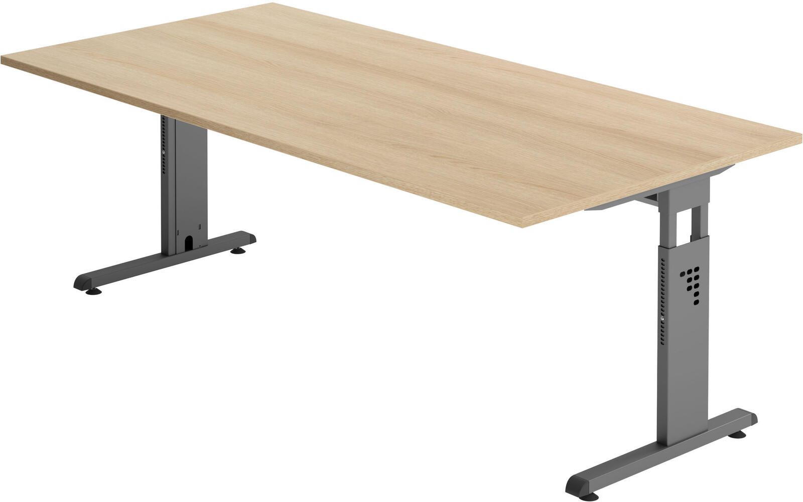 Der HAMMERBACHER höhenverstellbare Schreibtisch VOS2E/E/G in Eiche überzeugt durch seine funktionale Gestaltung und hochwertige Verarbeitung. Die Tischplatte besteht aus robuster Spanplatte, die nicht nur langlebig, sondern auch pflegeleicht ist. Der elegante Farbton Eiche verleiht jedem Büro oder Arbeitszimmer eine freundliche und einladende Atmosphäre. Das stabile C-Fuß-Gestell aus Stahl in einem modernen Grauton sorgt für eine hohe Standfestigkeit und ermöglicht eine flexible Nutzung des Schreibtisches. Mit den Maßen von 200 cm in der Breite, 100 cm in der Tiefe und einer minimalen Höhe von 65 cm bietet dieser Schreibtisch ausreichend Platz für Computer, Unterlagen und persönliche Gegenstände. Die Höhenverstellbarkeit des Schreibtisches ermöglicht es Ihnen, die optimale Arbeitshöhe individuell anzupassen, was zu einer besseren Ergonomie und einem komfortablen Arbeitsumfeld beiträgt. Dies ist besonders wichtig, um Verspannungen und Rückenbeschwerden vorzubeugen, die häufig durch langes Sitzen entstehen. Die klare und zeitlose Optik des HAMMERBACHER Schreibtisches passt zu verschiedenen Einrichtungsstilen und fügt sich harmonisch in moderne Büros sowie in private Arbeitsräume ein. Die schlichte Gestaltung ohne unnötige Fächer oder Schübe sorgt dafür, dass der Schreibtisch nicht überladen wirkt und ausreichend Platz für Ihre kreativen Ideen und Arbeitsmaterialien bietet. Die Kombination aus Funktionalität und ansprechendem Design macht den HAMMERBACHER höhenverstellbaren Schreibtisch VOS2E/E/G zu einer ausgezeichneten Wahl für alle, die Wert auf Qualität und Ergonomie am Arbeitsplatz legen. Erleben Sie die Vorteile eines höhenverstellbaren Schreibtisches und gestalten Sie Ihren Arbeitsbereich nach Ihren persönlichen Bedürfnissen.Technische Daten