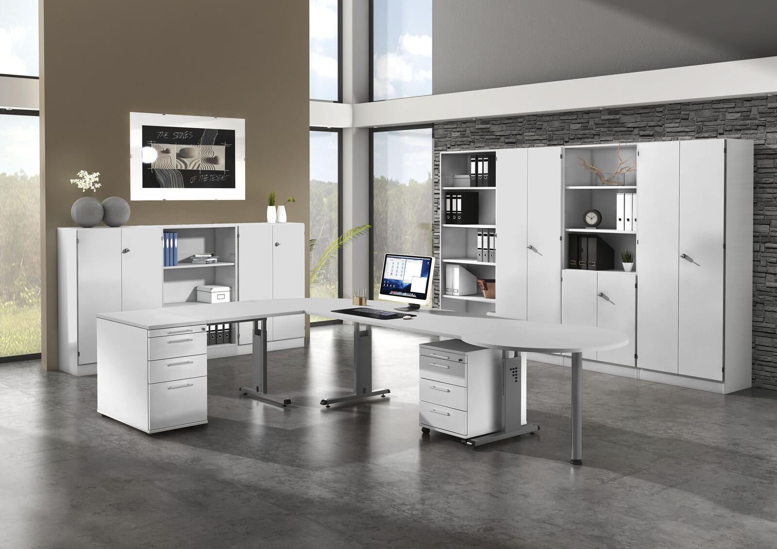 Die Ausführung des Gestells als C-Fuß-Gestell sorgt für zusätzliche Beinfreiheit und Beweglichkeit, während die schlichte, lichtgraue Farbgebung des Tischs eine beruhigende Atmosphäre schafft. Ohne Schubladen oder Fächer bleibt der Schreibtisch übersichtlich und bietet Ihnen die Möglichkeit, Ihre Arbeitsmaterialien nach Ihren Wünschen zu organisieren.