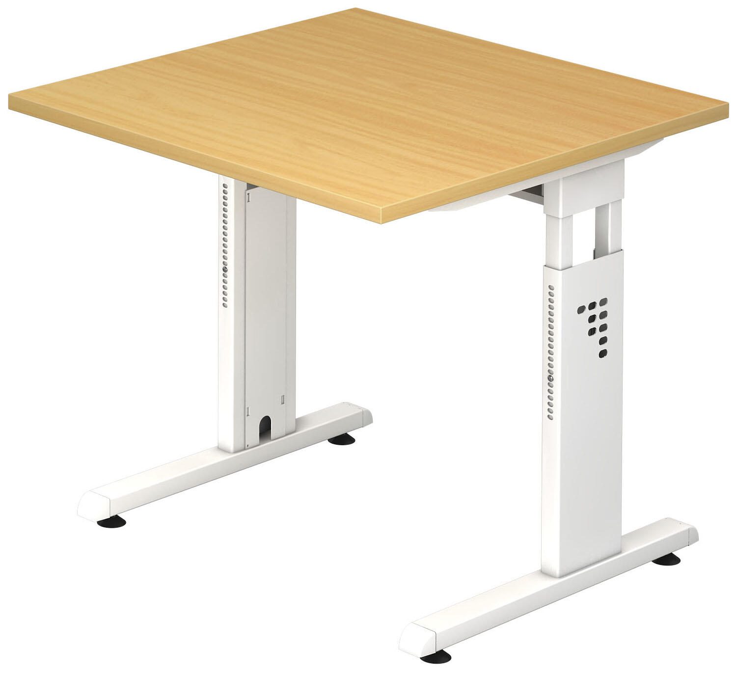 Das stabile C-Fuß-Gestell aus hochwertigem Stahl gewährleistet nicht nur eine hohe Belastbarkeit, sondern auch eine moderne und zeitlose Optik. Die weiße Farbgebung des Gestells harmoniert perfekt mit der warmen Holzoptik der Tischplatte und verleiht dem Schreibtisch ein elegantes Erscheinungsbild. Mit den Maßen von 80 cm in der Breite, 80 cm in der Tiefe und einer Höhe von 65 cm passt der Schreibtisch optimal in verschiedene Raumkonzepte, sei es im Homeoffice oder im Büro.