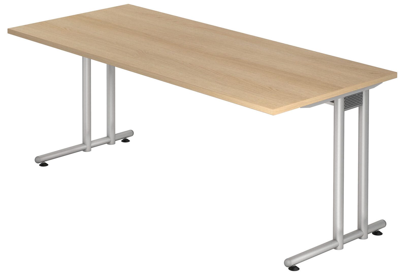 Der HAMMERBACHER Schreibtisch VNS19/E/S in Eiche ist die perfekte Wahl für alle, die einen stilvollen und funktionalen Arbeitsplatz suchen. Mit einer großzügigen Tischplatte aus Spanplatte bietet dieser Schreibtisch ausreichend Platz für Ihren Laptop, Notizen und andere Arbeitsmaterialien. Die edle Eichenfarbe verleiht Ihrem Büro oder Arbeitszimmer eine warme und einladende Atmosphäre, während das silberne Stahlgestell nicht nur stabil ist, sondern auch einen modernen Akzent setzt. Mit den Maßen von 180 cm in der Breite, 80 cm in der Tiefe und 72 cm in der Höhe ist dieser Schreibtisch ideal für verschiedene Raumgrößen und lässt sich problemlos in jedes Einrichtungskonzept integrieren. Das innovative C-Fuß-Gestell sorgt für eine optimale Beinfreiheit und ermöglicht Ihnen, bequem zu arbeiten, ohne sich eingeengt zu fühlen. Ob Sie im Homeoffice arbeiten oder einen Platz für kreative Projekte benötigen, der HAMMERBACHER Schreibtisch bietet Ihnen die Flexibilität und den Komfort, den Sie benötigen. Dank des schlichten Designs und der hochwertigen Materialien fügt er sich harmonisch in jede Umgebung ein und bleibt dabei äußerst langlebig. Dieser Schreibtisch ist nicht nur funktional, sondern auch ästhetisch ansprechend. Die Kombination aus der natürlichen Holzoptik und dem stabilen Metallgestell sorgt für ein zeitloses Erscheinungsbild, das nie aus der Mode kommt. Verleihen Sie Ihrem Arbeitsbereich mit dem HAMMERBACHER Schreibtisch VNS19/E/S in Eiche einen Hauch von Eleganz und Professionalität.