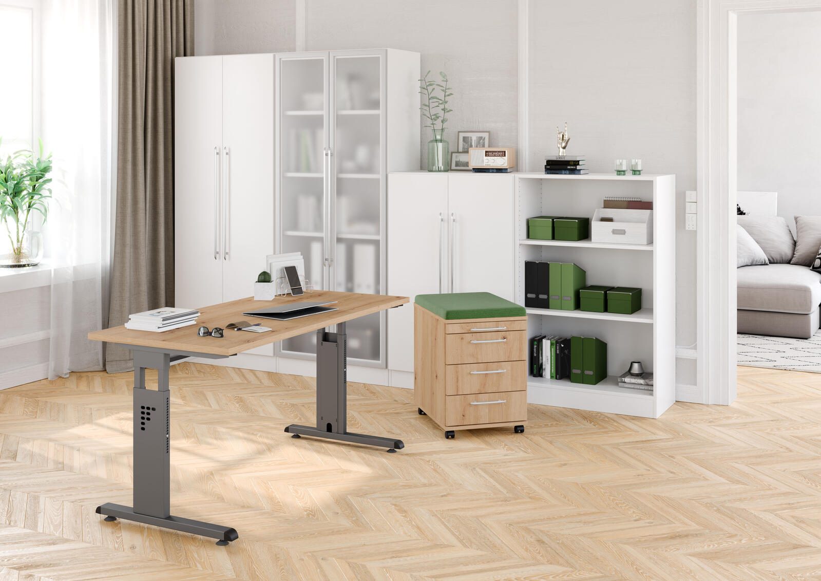 Das Gestell des Schreibtisches ist aus stabilem Stahl gefertigt und in einem modernen Grafit-Farbton gehalten. Diese Kombination sorgt für eine hohe Stabilität und Langlebigkeit. Die C-Fuß-Gestell-Ausführung bietet nicht nur eine optimale Beinfreiheit, sondern auch eine zeitgemäße Ästhetik, die sich harmonisch in verschiedene Raumkonzepte einfügt.