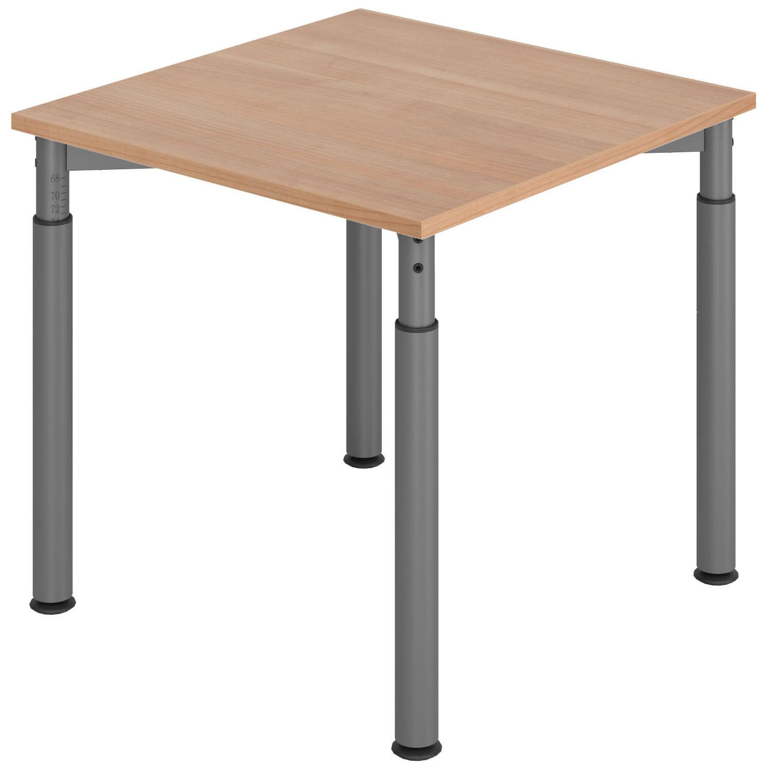 Der HAMMERBACHER höhenverstellbare Schreibtisch VYS08/N/G in edlem Nussbaum ist die ideale Lösung für Ihr modernes Arbeitsumfeld. Mit einer Tischplatte aus robuster Spanplatte bietet dieser Schreibtisch nicht nur eine ansprechende Optik, sondern auch eine hohe Stabilität und Langlebigkeit. Das grafitfarbene Stahlgestell sorgt für eine solide Basis und verleiht dem Tisch eine zeitgemäße Note. Die Maße von 80 cm in der Breite und Tiefe sowie eine Höhe von 68 cm machen diesen Schreibtisch zu einem kompakten Möbelstück, das sich problemlos in verschiedene Raumkonzepte integrieren lässt. Der höhenverstellbare Mechanismus ermöglicht es Ihnen, die Tischhöhe individuell anzupassen, sodass Sie sowohl im Sitzen als auch im Stehen ergonomisch arbeiten können. Dies fördert nicht nur Ihre Gesundheit, sondern steigert auch Ihre Produktivität, indem es Ihnen die Flexibilität gibt, Ihre Arbeitsposition nach Bedarf zu wechseln. Der Schreibtisch gehört zur Serie YS08 und ist besonders geeignet für diejenigen, die Wert auf Funktionalität und Design legen. Die schlichte Eleganz des Nussbaum-Farbtons harmoniert hervorragend mit dem grafitfarbenen Gestell, wodurch der Tisch sowohl in modernen als auch in klassischen Büroumgebungen einen hervorragenden Eindruck hinterlässt. Ohne Fächer oder Schübe bietet der HAMMERBACHER Schreibtisch ausreichend Platz für Ihre Arbeitsmaterialien und sorgt für eine aufgeräumte und übersichtliche Arbeitsfläche. Die Kombination aus hochwertigem Material und durchdachtem Design macht diesen Schreibtisch zu einer ausgezeichneten Wahl für alle, die ein stilvolles und funktionales Möbelstück suchen.Technische Daten