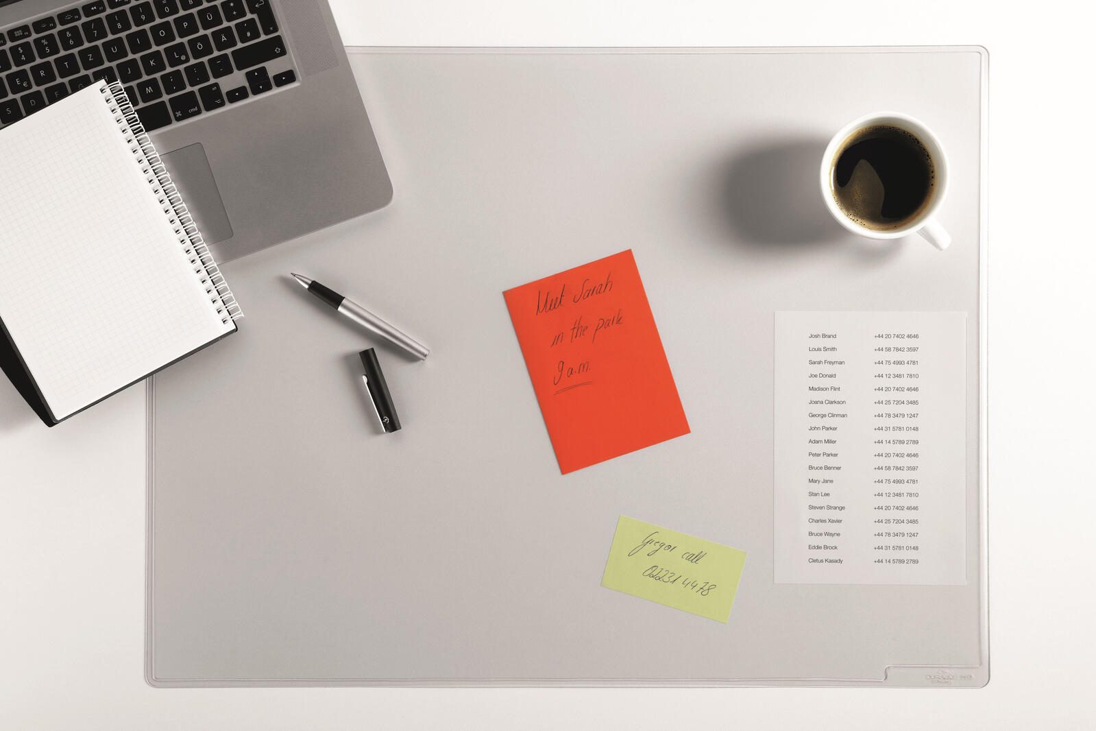 Die DURABLE Duraglas Schreibtischunterlage ist die perfekte Ergänzung für jeden Arbeitsplatz. Mit ihren großzügigen Maßen von 53,0 x 40,0 cm bietet sie ausreichend Platz für deine Unterlagen und sorgt gleichzeitig für eine stilvolle und organisierte Arbeitsumgebung. Hergestellt aus hochwertigem PVC, vereint diese Schreibtischunterlage Funktionalität und ansprechendes Design. Die transparente Farbe ermöglicht es dir, den darunter liegenden Schreibtisch oder wichtige Dokumente sichtbar zu halten, während sie gleichzeitig einen Schutz vor Kratzern, Flecken und Abnutzung bietet. So bleibt dein Arbeitsplatz nicht nur sauber, sondern auch ansprechend. Dank der robusten Materialien ist die DURABLE Duraglas Schreibtischunterlage äußerst langlebig und widerstandsfähig, was sie zu einer lohnenden Investition für jeden Büro- oder Heimarbeitsplatz macht. Ein weiterer Vorteil der DURABLE Duraglas Schreibtischunterlage ist ihre einfache Reinigung. Ein feuchtes Tuch genügt, um die Oberfläche von Staub und Schmutz zu befreien, sodass du stets in einer gepflegten Umgebung arbeiten kannst. Die rutschfeste Unterseite sorgt dafür, dass die Unterlage an ihrem Platz bleibt und nicht verrutscht, egal wie hektisch dein Arbeitstag auch sein mag. Mit der DURABLE Duraglas Schreibtischunterlage entscheidest du dich nicht nur für ein praktisches, sondern auch für ein ästhetisches Produkt, das deinem Arbeitsplatz einen modernen Touch verleiht. Ideal für Schüler, Studenten und Berufstätige, die Wert auf eine ansprechende und funktionale Arbeitsumgebung legen.Technische Daten