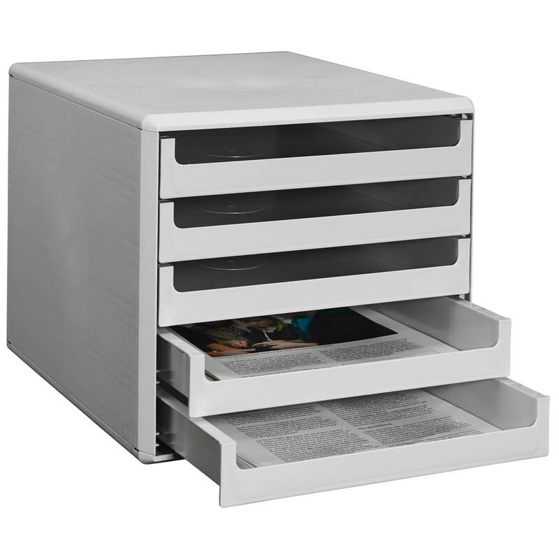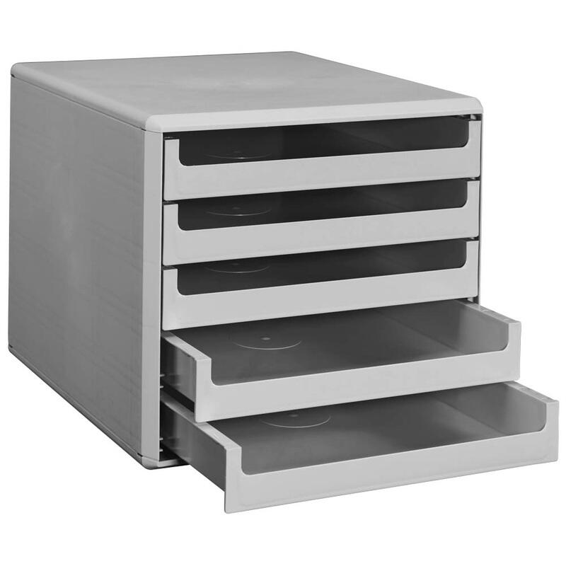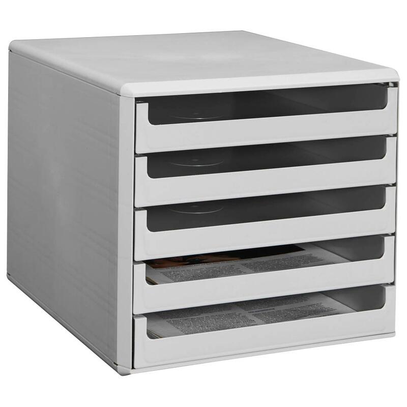 Die Schubladenbox verfügt über fünf offene Schubladen, die ein einfaches und bequemes Verstauen deiner Dokumente ermöglichen. Ihr lichtgrauer Farbton verleiht deinem Arbeitsplatz ein modernes und ordentliches Aussehen.