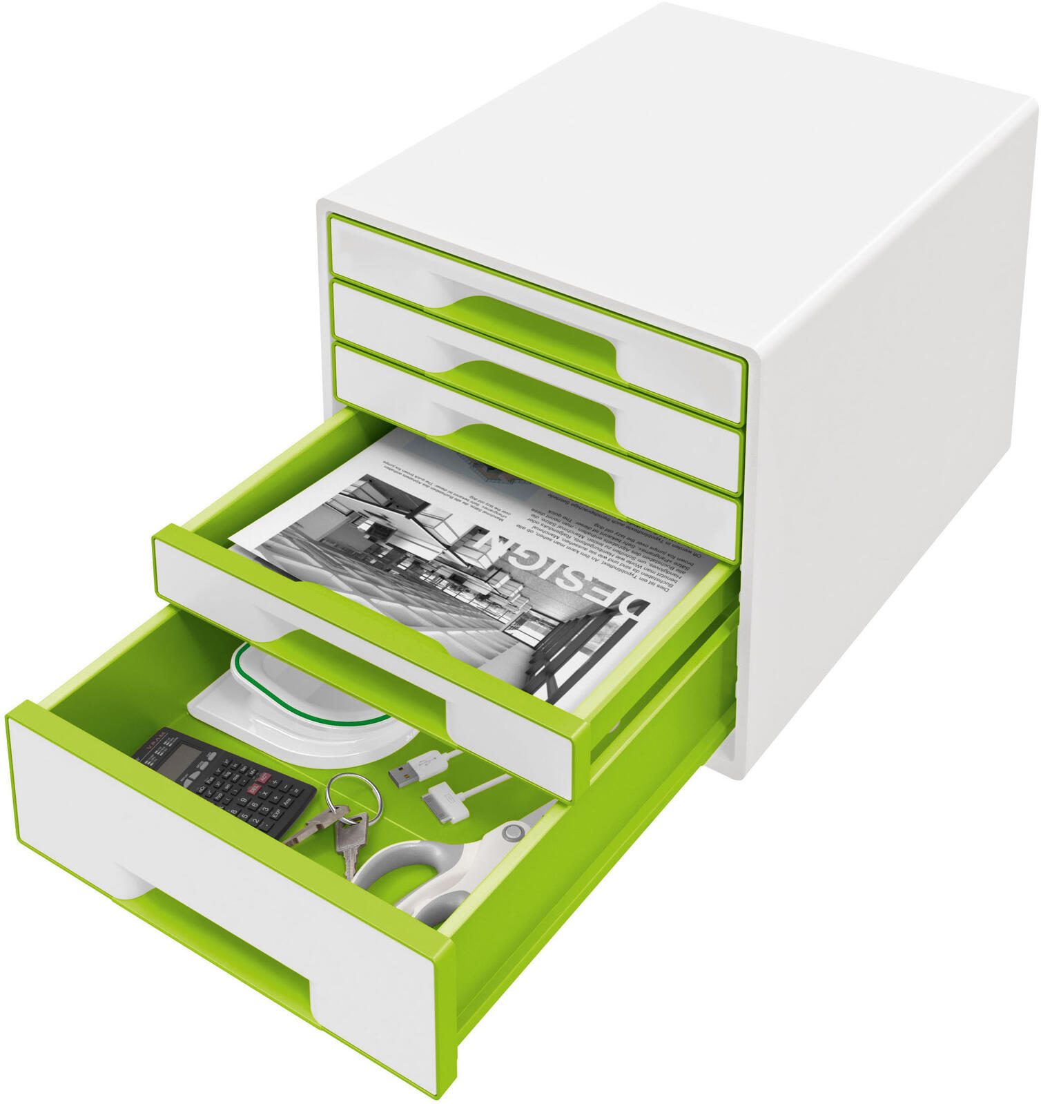 Die LEITZ Schubladenbox 52142054 ist die ideale Lösung für eine organisierte und effiziente Aufbewahrung in deinem Büro oder Zuhause. Mit den kompakten Maßen von 28,7 x 36,3 x 27,0 cm passt sie perfekt auf deinen Schreibtisch oder in Regale und bietet dennoch ausreichend Platz für all deine Unterlagen im DIN A4 Format. Die Schubladenbox verfügt über insgesamt fünf Schubladen, darunter vier flache und eine hohe Schublade, die dir vielfältige Möglichkeiten zur Sortierung und Aufbewahrung bieten. Die Schubladen sind in einem ansprechenden perlweißen und grünen Farbton gehalten, wodurch die Box nicht nur funktional, sondern auch ein echter Hingucker in jedem Raum ist. Hergestellt aus hochwertigem Polystyrol, zeichnet sich die LEITZ Schubladenbox durch ihre Langlebigkeit und Stabilität aus. Die geschlossenen Schubladen sorgen dafür, dass deine Dokumente sicher und staubfrei aufbewahrt werden, während das stapelbare Design dir erlaubt, mehrere Boxen platzsparend übereinander zu lagern. Mit der Schubladenbox von LEITZ kannst du deine Unterlagen effizient organisieren und schnell auf die benötigten Dokumente zugreifen. Die WOW Cube Serie verbindet modernes Design mit praktischer Funktionalität, sodass du nicht nur Ordnung schaffst, sondern auch einen stilvollen Akzent in deinem Arbeitsumfeld setzt. Egal, ob für Büromaterialien, wichtige Dokumente oder kreative Projekte, die LEITZ Schubladenbox ist die perfekte Wahl für eine übersichtliche und ansprechende Aufbewahrungslösung.Technische Daten